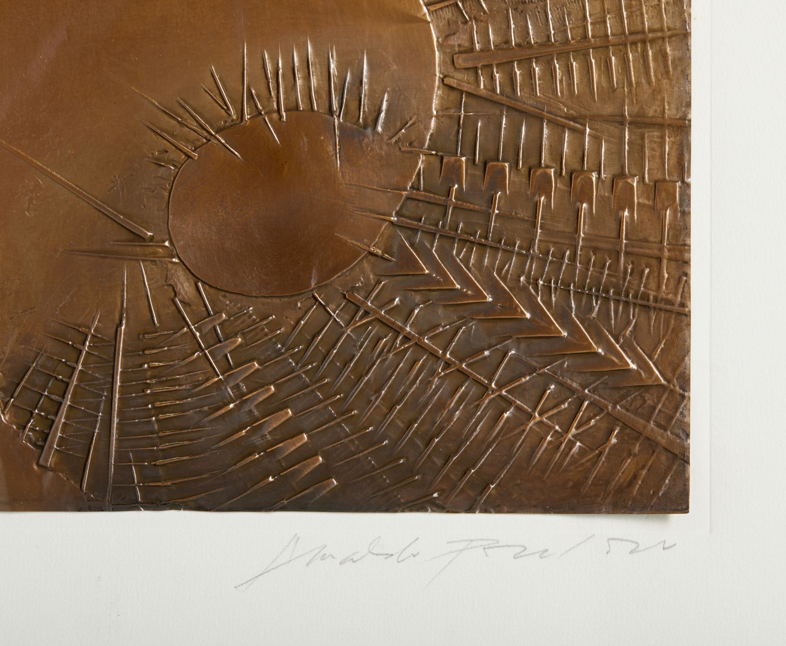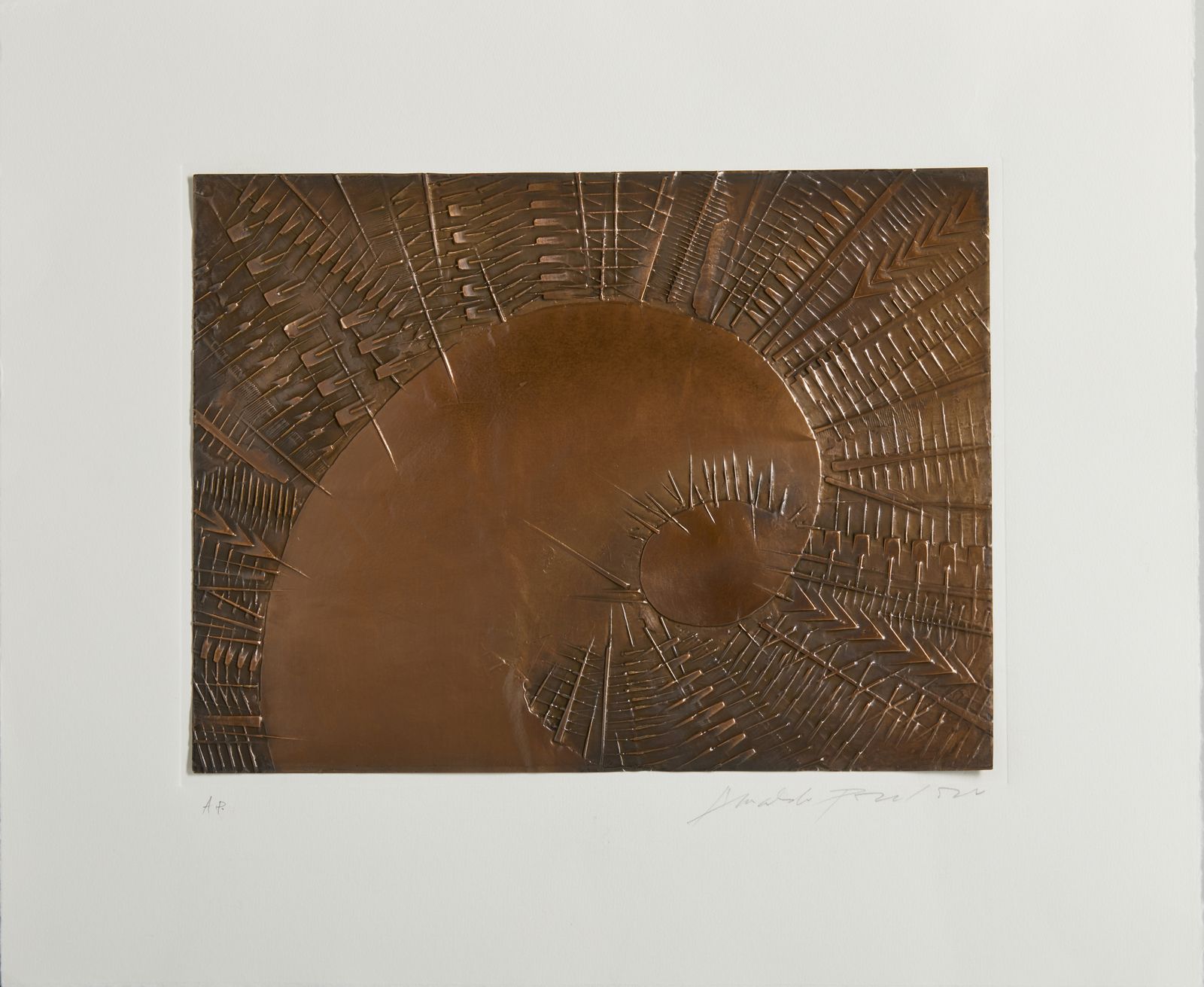 firma e tiratura a matita, es.a.pdimensione lastra: 30x40cm. Arte 3 di Alberto Serighelli, MilanoEDIZIONE TOTALE100 esemplari in numeri arabi + X numeri romani + prove d'artistaL'opera è registrata presso il Catalogue Raisonné - sez. grafiche della Fondazione Arnaldo Pomodoro con il n. GR/136Grafica contenuta nella cartella realizzata per l’iniziativa “Regione Lombardia per l’Abruzzo” con opere di Giovanni Frangi, Mimmo Paladino, Arnaldo Pomodoro, Ugo Riva.Grafica realizzata in collegamento con il rilievo in bronzo Bassorilievo