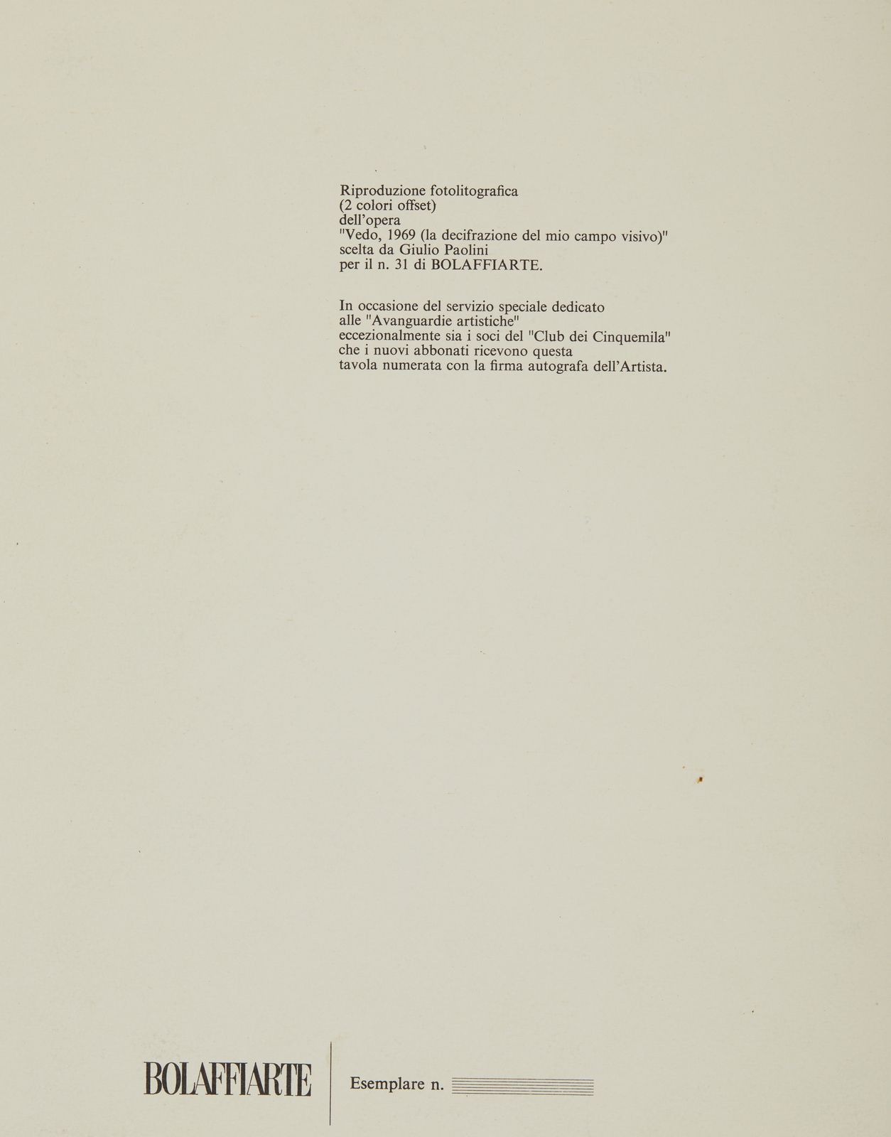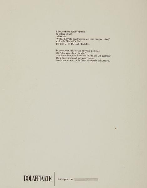 firma, data e dedica a Lucio Amelio a matitaPROVENIENZACollezione Lucio Amelio, NapoliCollezione privata, NapoliFoglio n.31 di BOLAFFIARTE realizzato in occasione del servizio speciale dedicato alle Avanguardie artistiche eccezionalmente sia i soci del Club dei Cinquemila che i nuovi abbonati ricevono questa tavola numerata con la firma autografa dell'Artista.