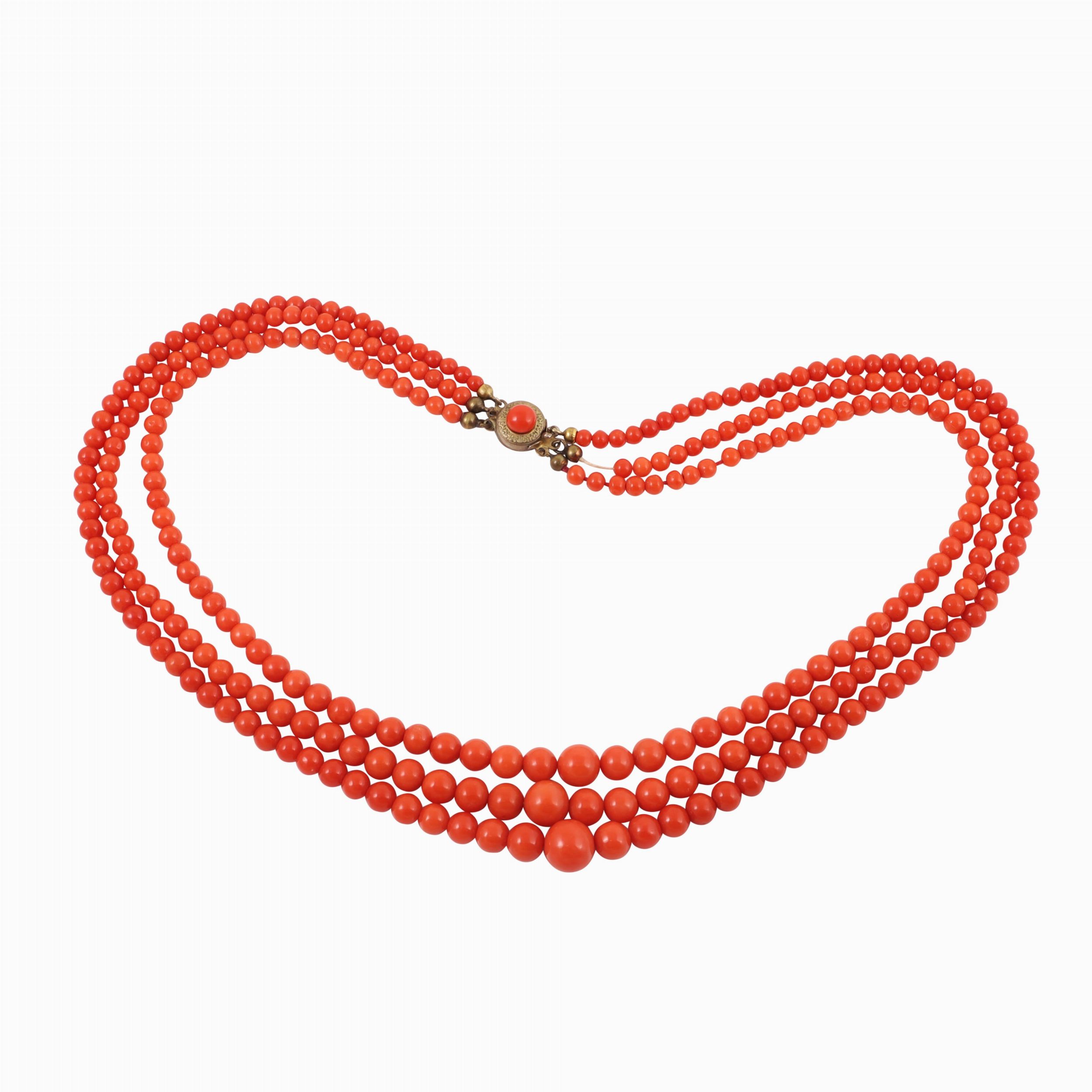 a tre fili di sfere di corallo posti in gradazione. Chiusura in argento c on corallo tondo, gr. 63,4. Lunghezza 46