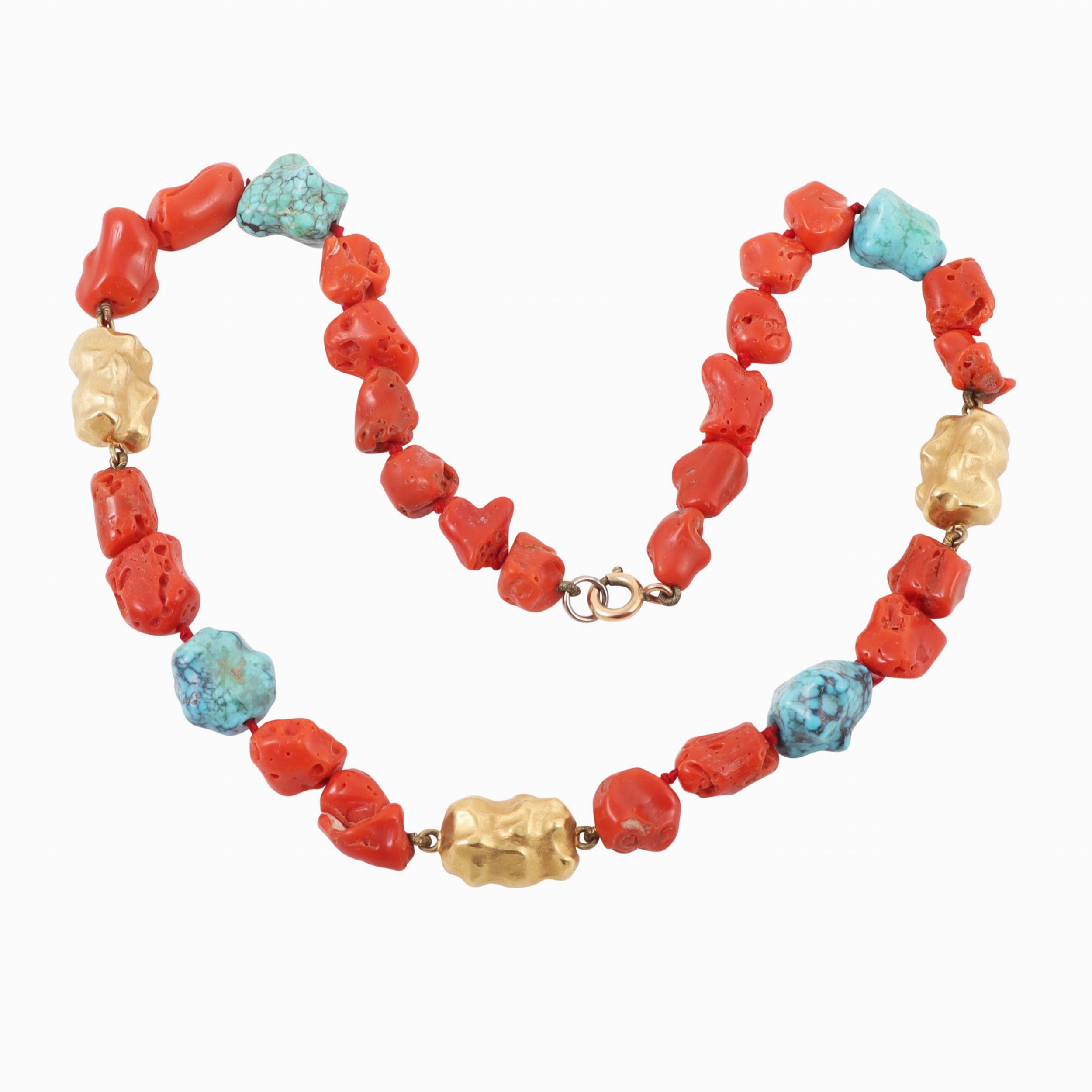 a un filo di coralli alternati a turchesi di forma irregolare e tre elementi cavi in oro giallo lavorati a guisa di pepita. Chiusura a moschettone in oro e maglia in metallo. Lunghezza 49 cm