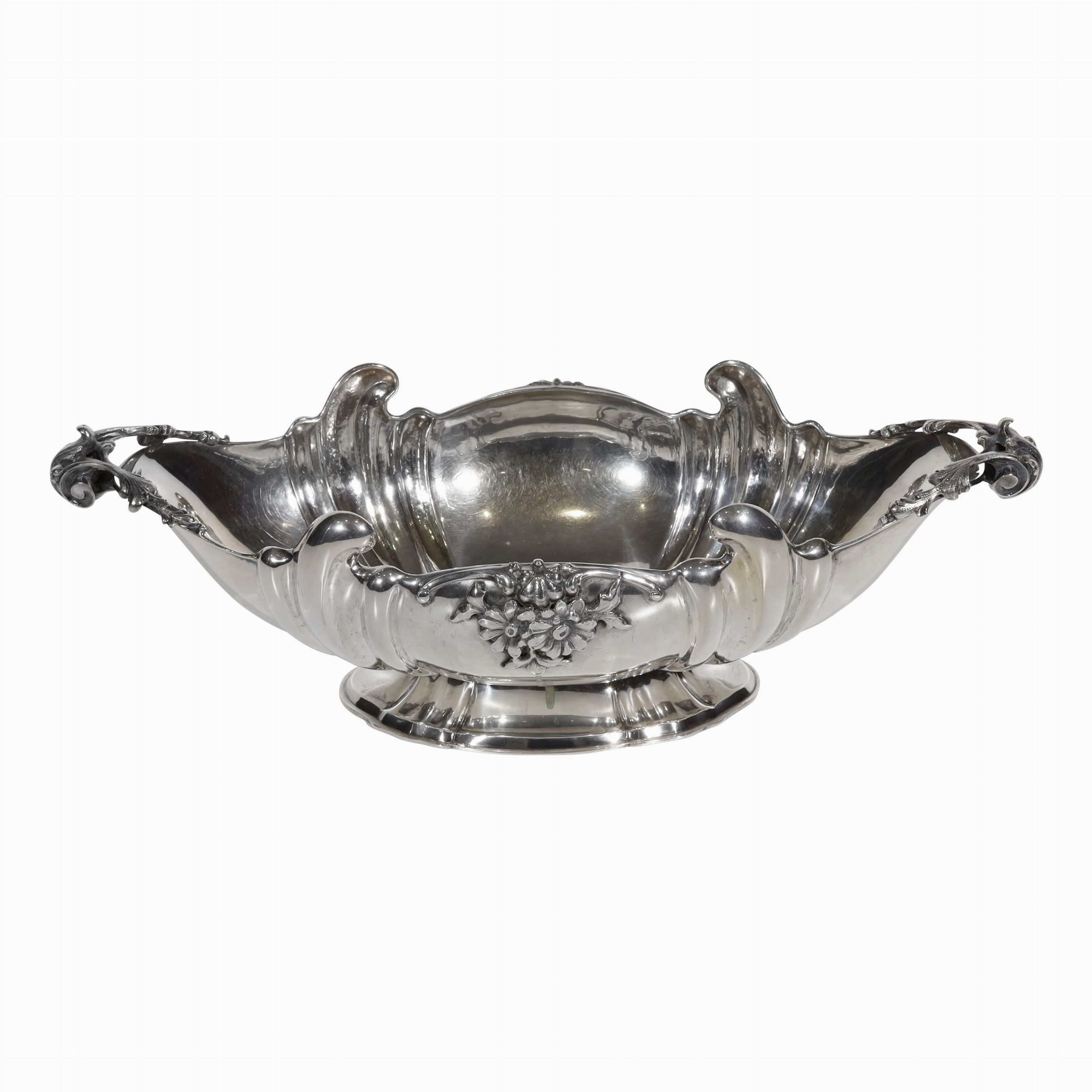 in argento a navicella con motivi floreali applicati, bordura di linea mossa e prese laterali fogliate, gr. 1.130 ca. Dimensioni 43 x 21 (h) 13 cm ca. Numerario: 317 MI con fascio littorio (Borghetti Ugo - Milano)
