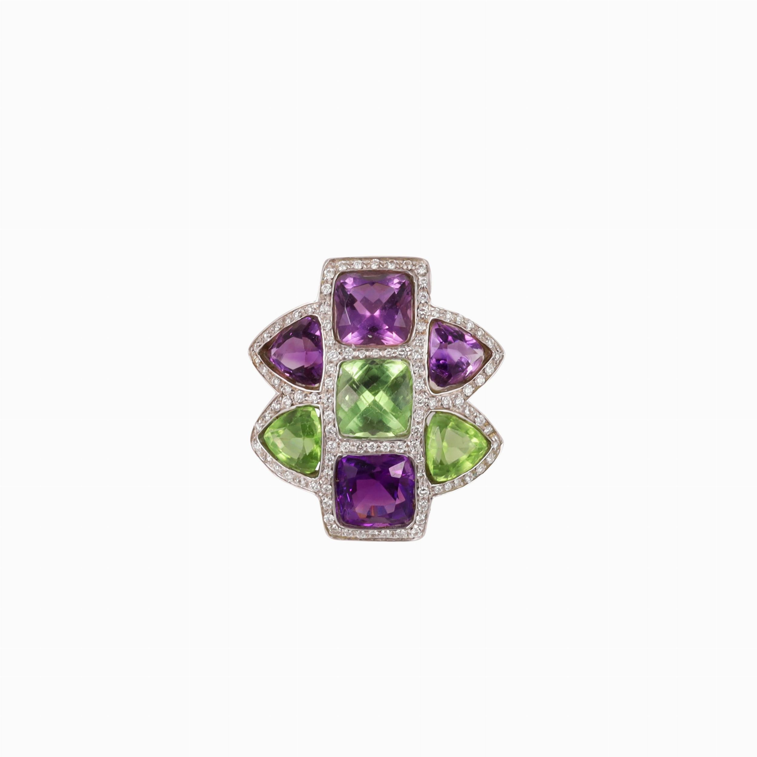 in oro bianco con motivo geometrico a mosaico, composto da ametiste e peridoti triangolari e quadrati, profilati da brillanti, riproposti anche sui lati della montatura, gr. 32,5. Brillanti del peso complessivo di 2 ct ca. (uno mancante) Misura 20,5