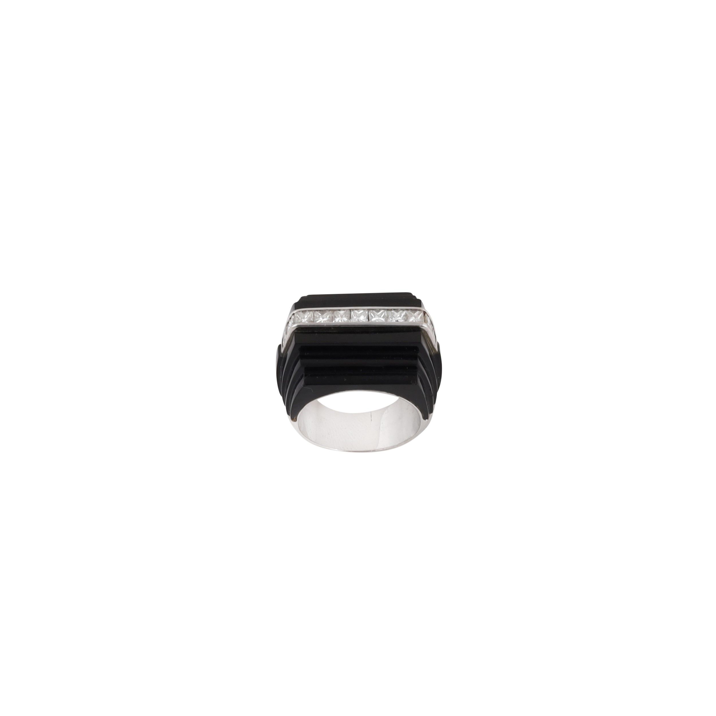 in oro bianco a fascia squadrata con onice gradinata sormontata da brillanti disposti in linea, gr. 14,8. Misura 11