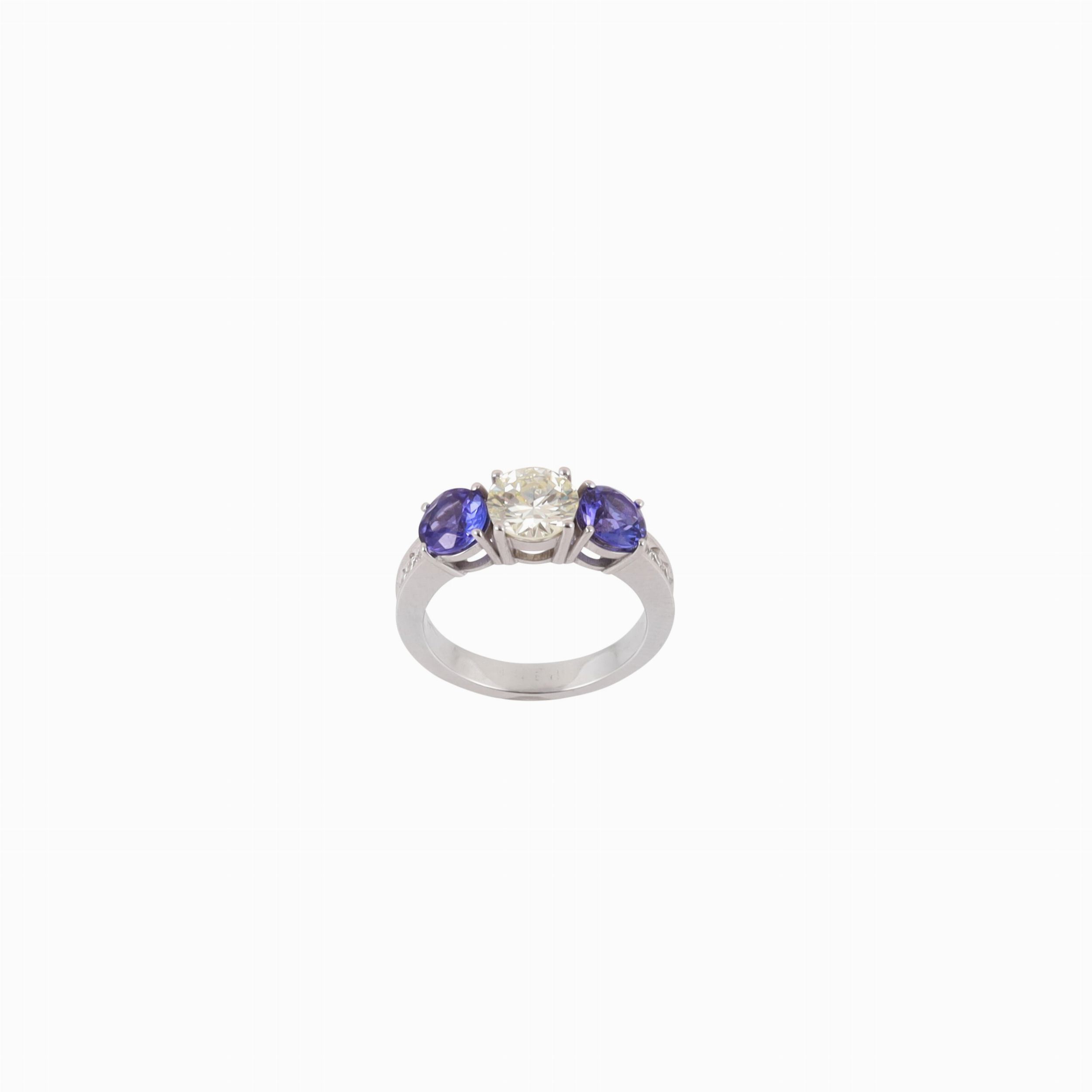 in oro bianco con brillante del peso di 0,95 ct ca., affiancato da due tanzaniti e brillanti disposti in linea, gr. 5,1. Misura 11,5 Firmato: Cave