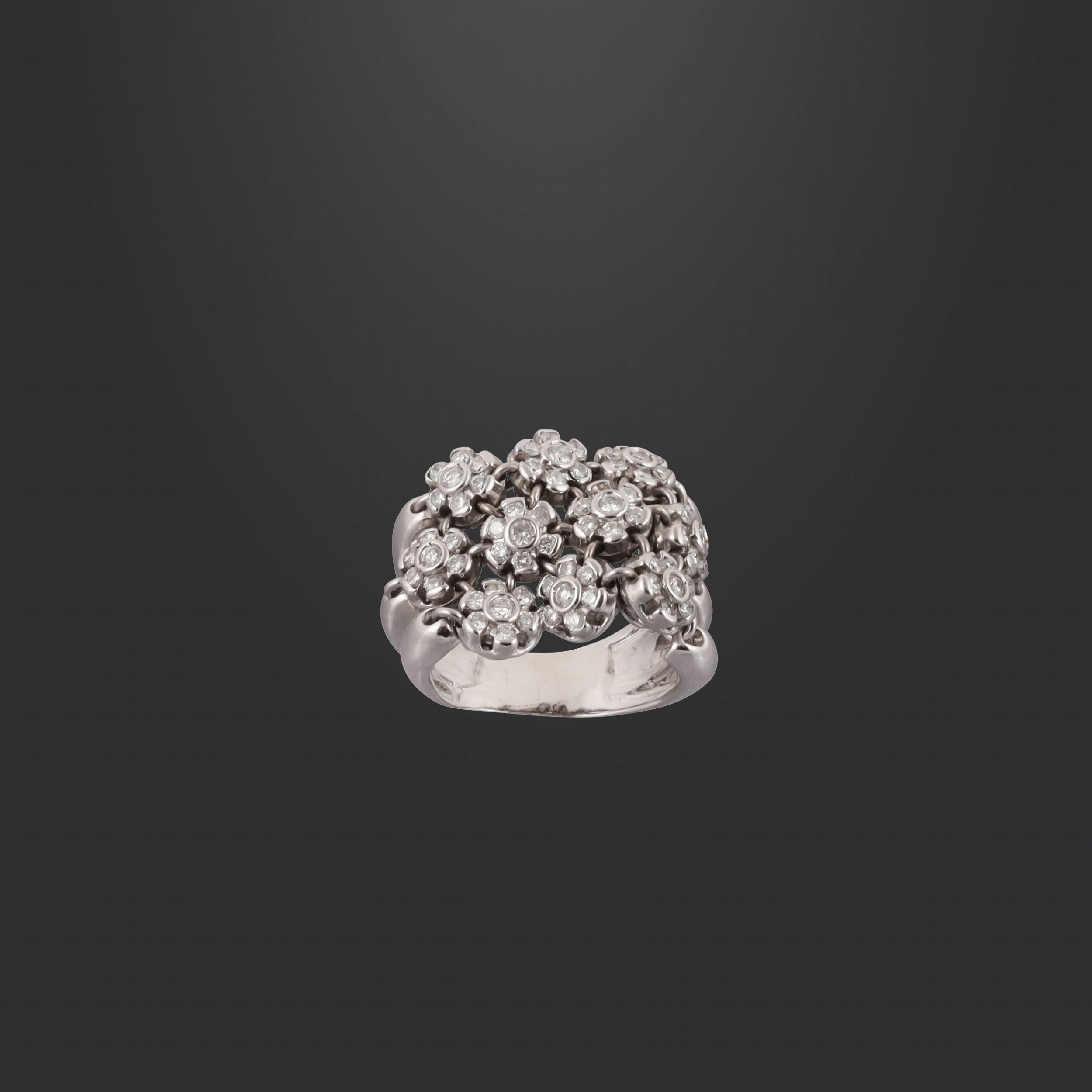 in oro bianco a fascia con parte anteriore morbida formata da fiorellini in brillanti, gr. 16. Misura 21