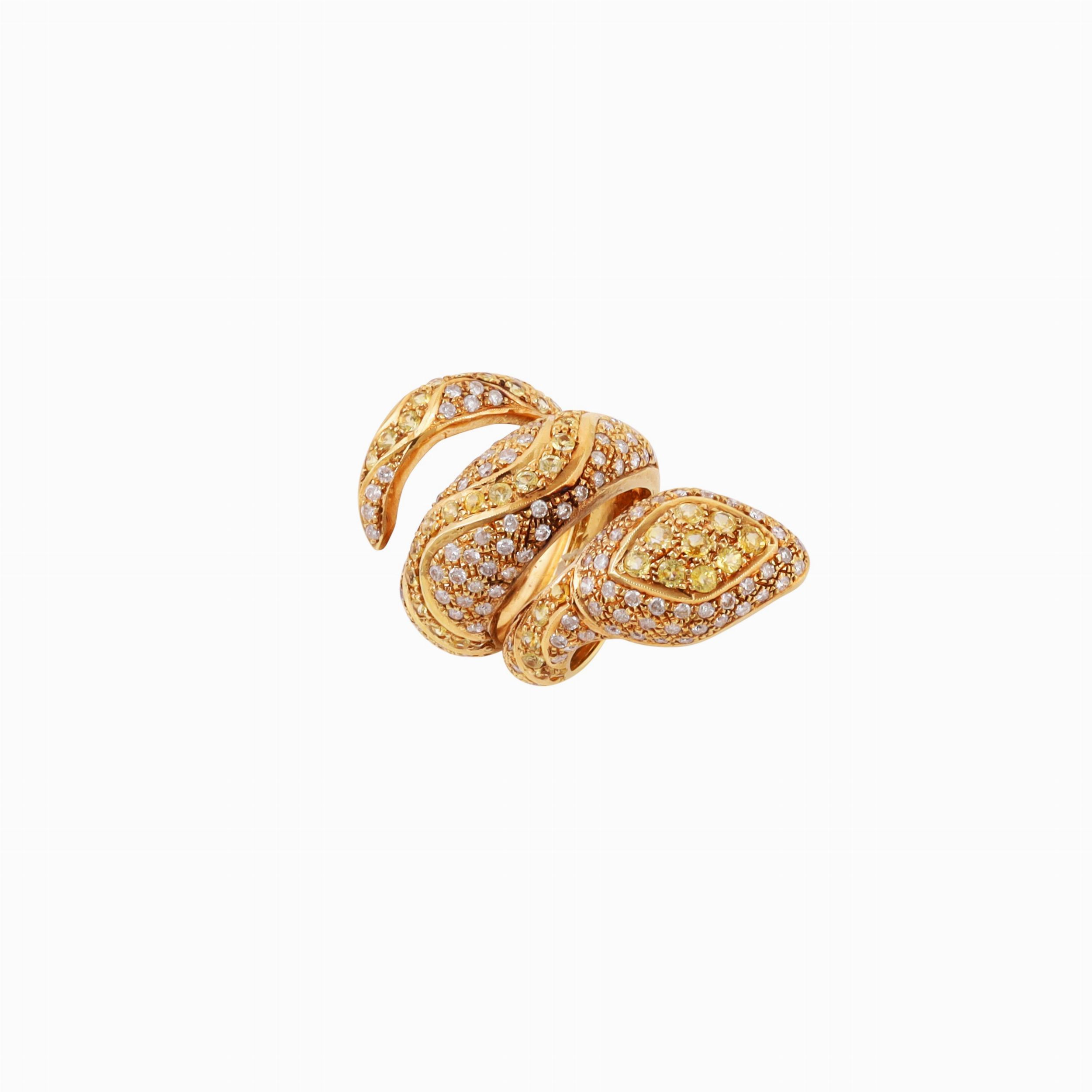 in oro giallo impreziosito da brillanti del peso complessivo di 1,20 ct ca. e corindoni gialli, gr. 22,3. Misura 15