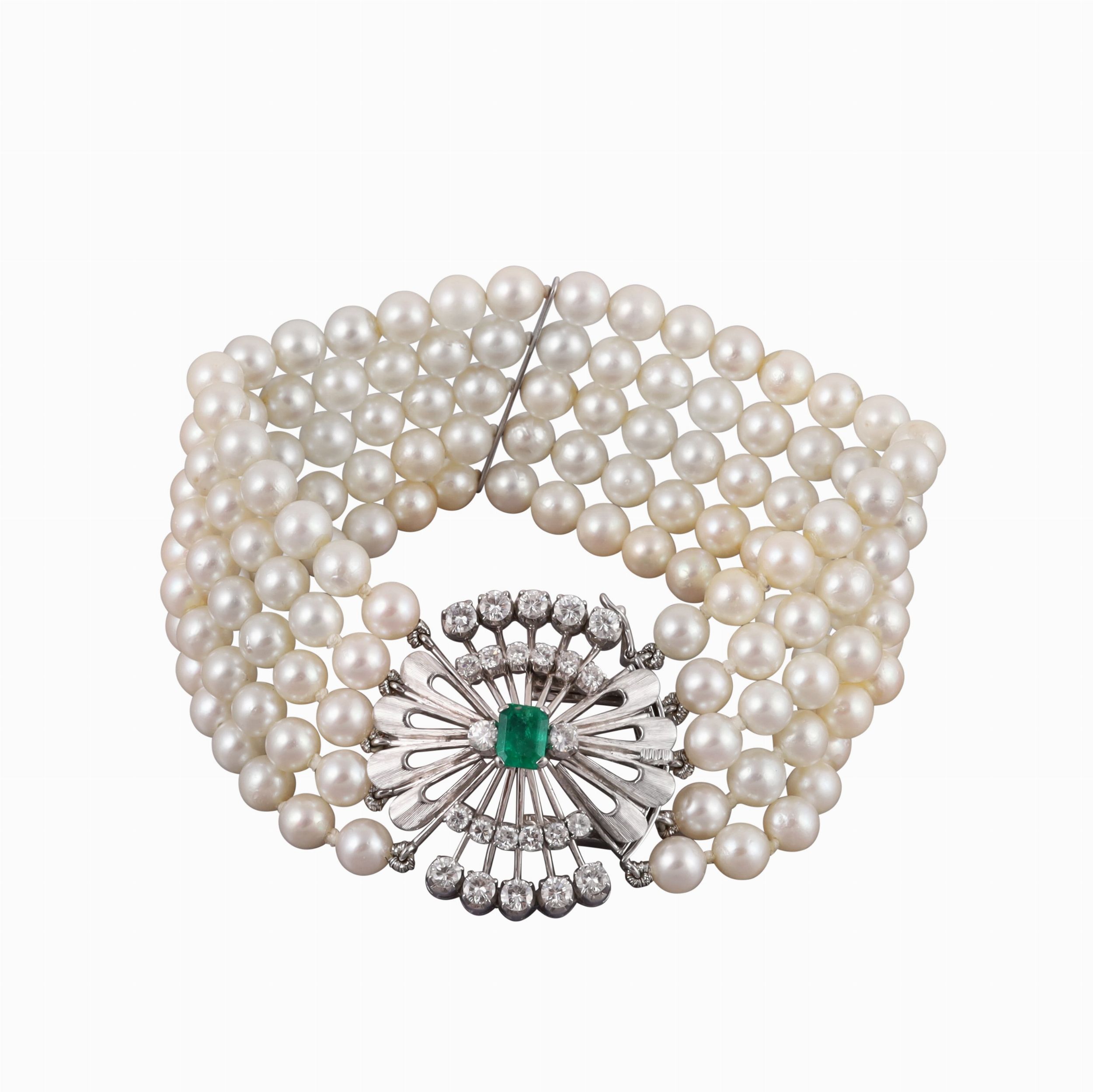 a cinque fili di perle coltivate, chiusura in oro bianco a rosone con smeraldo rettangolare e brillanti del peso complessivo di 2,10 ct ca. Lunghezza 19 cm