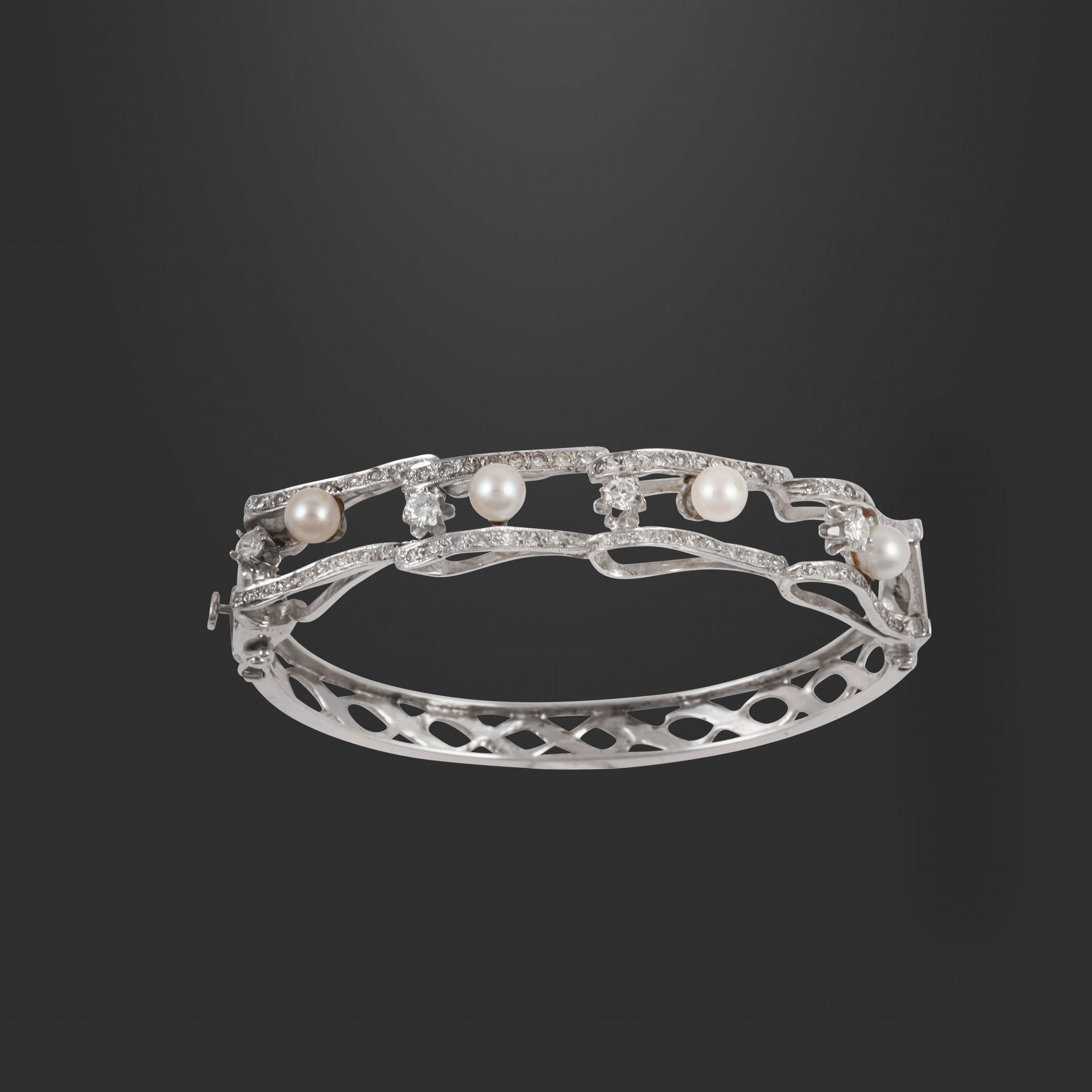 rigido in oro basso, con motivo anteriore ondulato ornato da brillanti, piccoli diamanti e perle coltivate, gr. 20. Misura 15,5 cm ca.