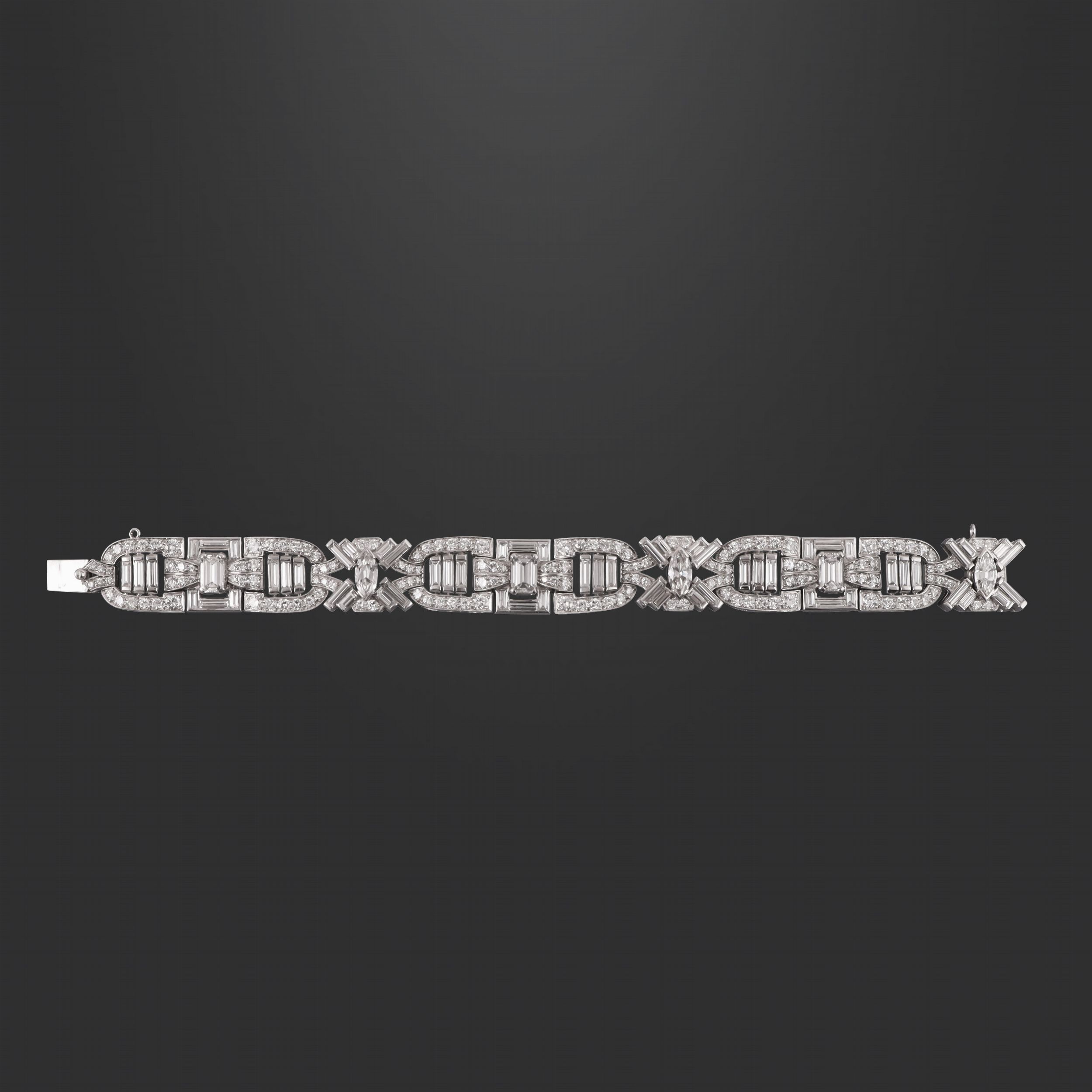 in oro bianco formato da tre elementi geometrici traforati di forma allungata, impreziositi da diamanti rettangolari, brillanti e diamanti baguettes, raccordati fra loro da motivi incrociati con diamanti navettes e baguettes, gr. 52,7. Diamanti del peso complessivo di 18 ct ca. Lunghezza 18 cm
