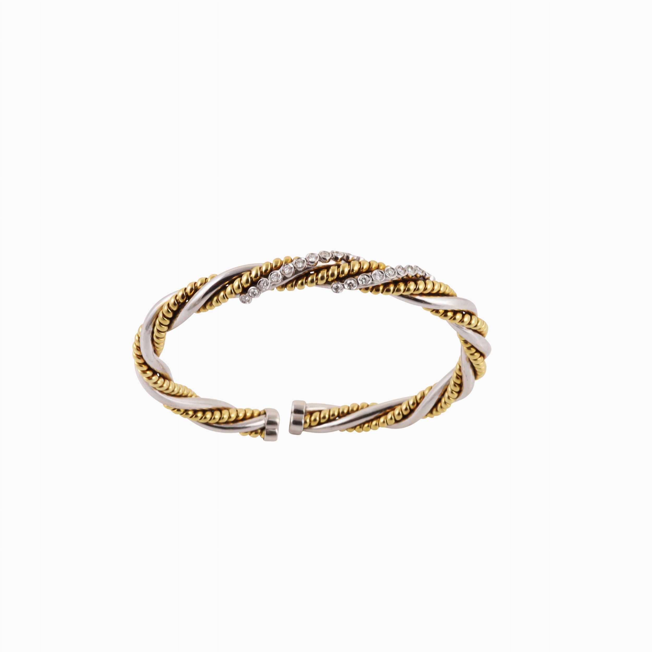 rigido a motivo intrecciato in oro giallo e bianco ornato anteriormente da brillanti, gr. 36,8. Misura 18 cm ca. Numerario: 1932 AL (Legnazzi Roberto s.p.a. - Valenza)