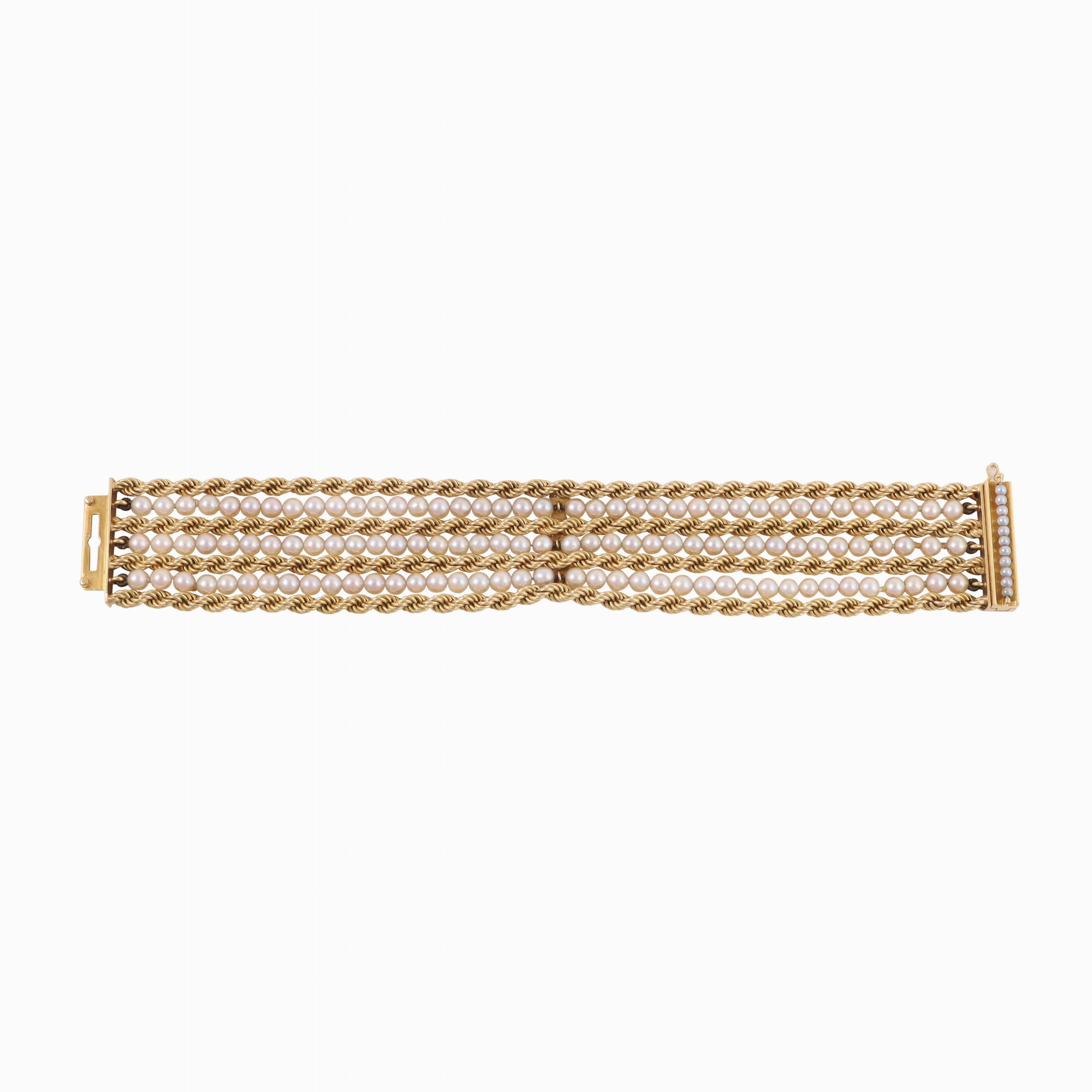 a sette fili in oro giallo a cordoncino, alternati a fili di perle coltivate. Chiusura a barretta percorsa da piccole perle, gr. 74,7. Lunghezza 18,5 cm Numerario: 15 VR (Weingrill Carlo S.p.A. - Verona)