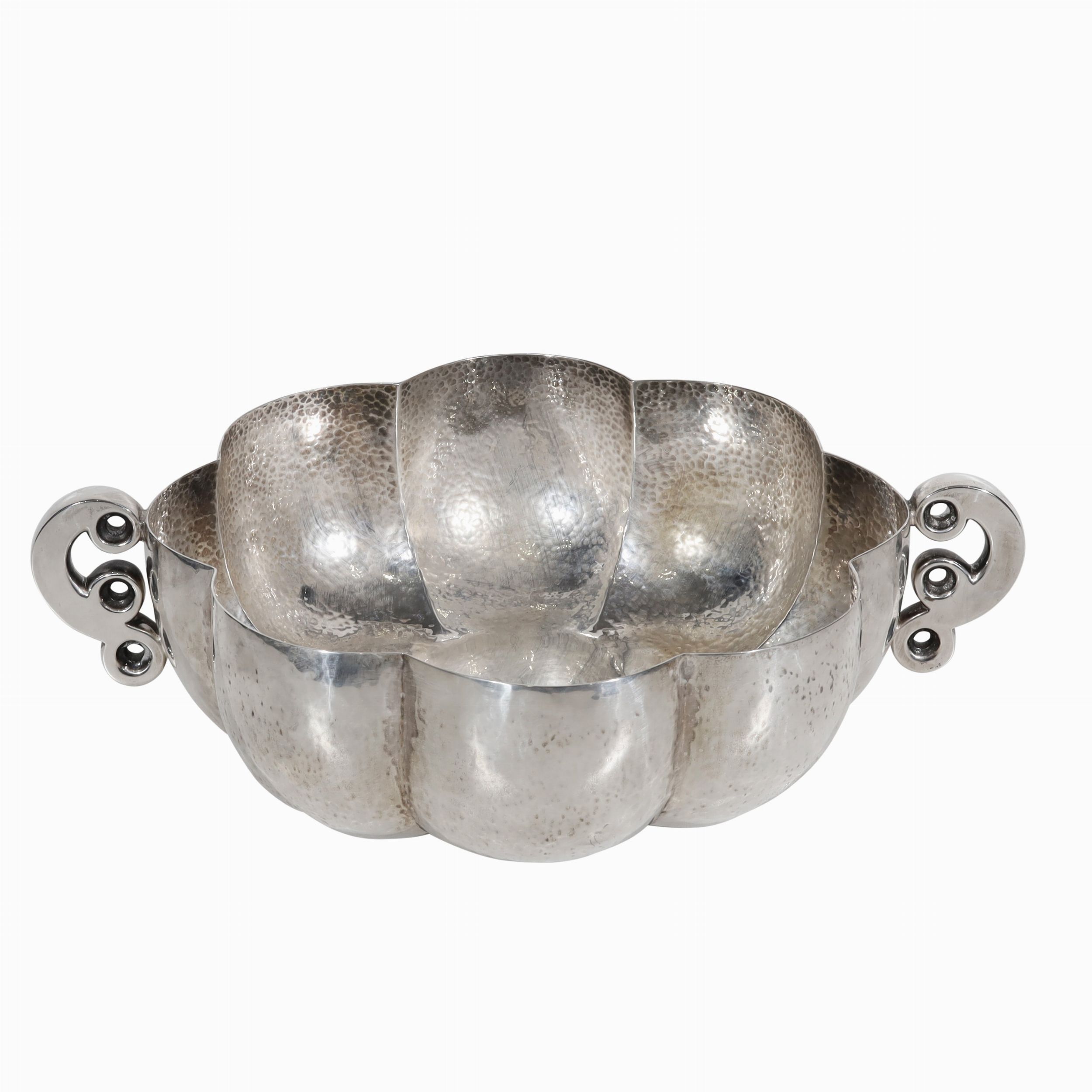 in argento, corpo circolare baccellato a lavorazione martellata. Prese laterali lobate, gr. 1.160 ca. Diametro 25,5 cm, altezza 8,5 cm ca.