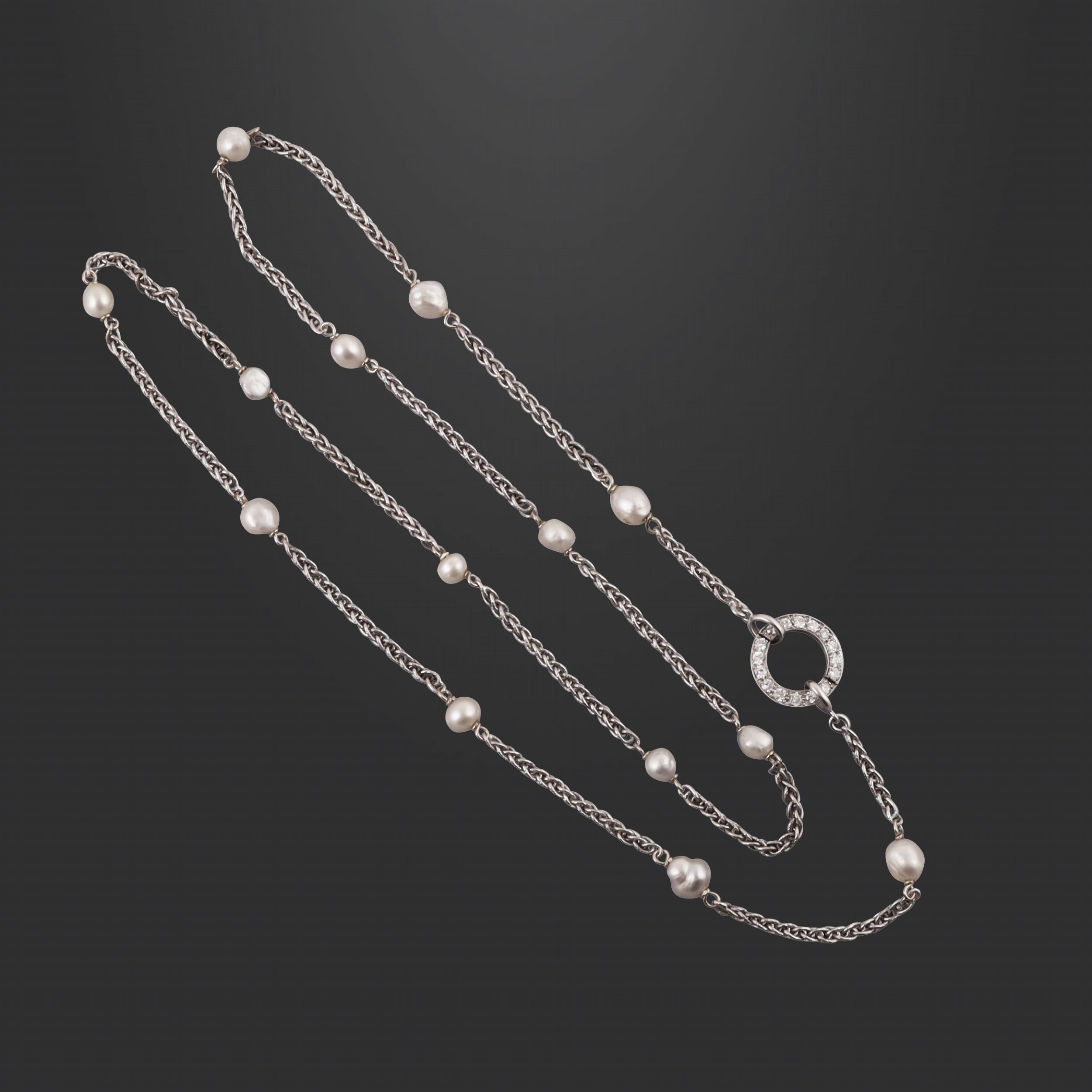 in oro bianco con catenelle inframmezzate da perle d'acqua dolce, fermezza ad anello in brillanti, gr. 19,2. Lunghezza 66 cm