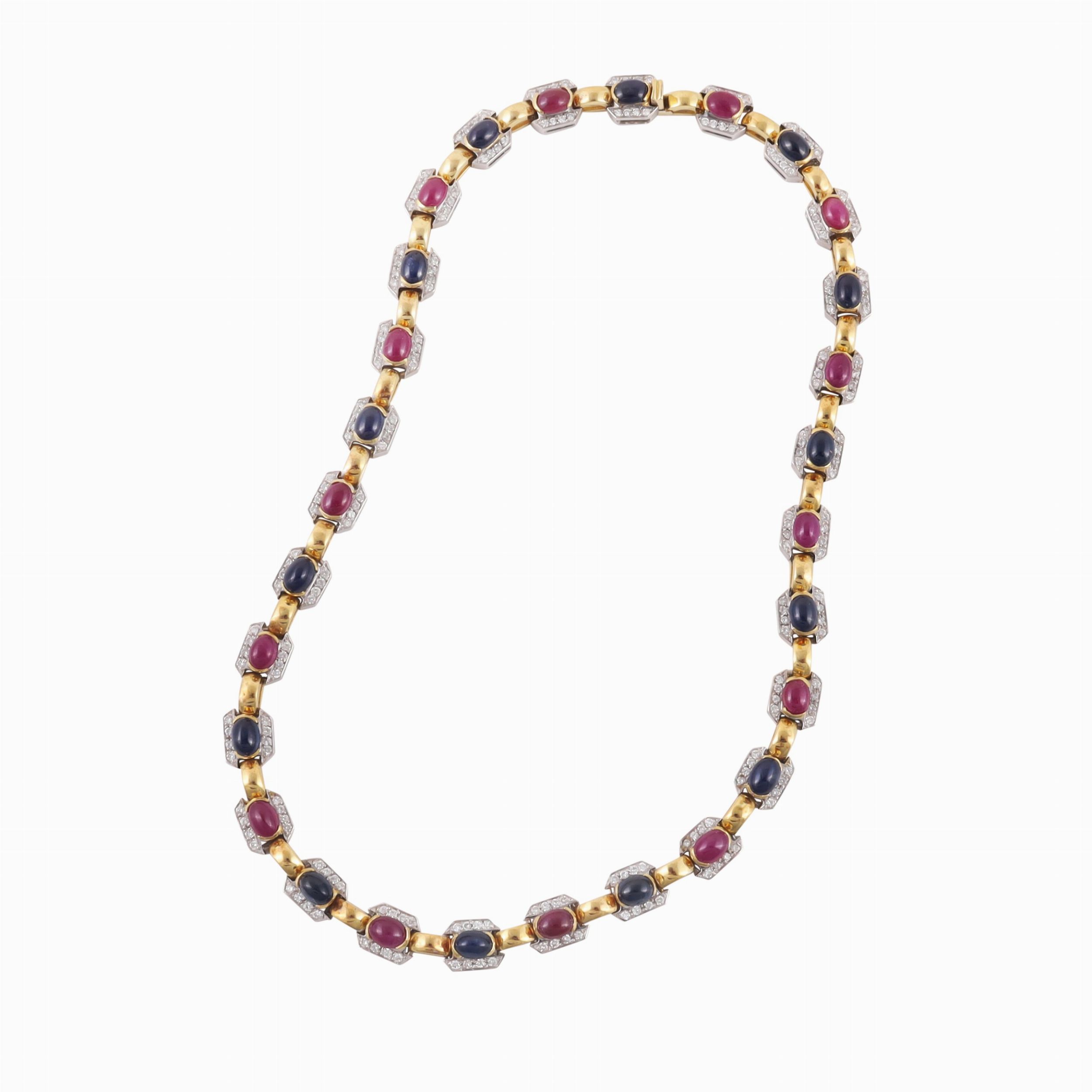girocollo in oro giallo e bianco, composto da elementi geometrici con brillanti del peso complessivo di 3,50 ct ca., zaffiri e rubini ovali taglio cabochon alternati, gr. 82,4. Lunghezza 43,5 cm