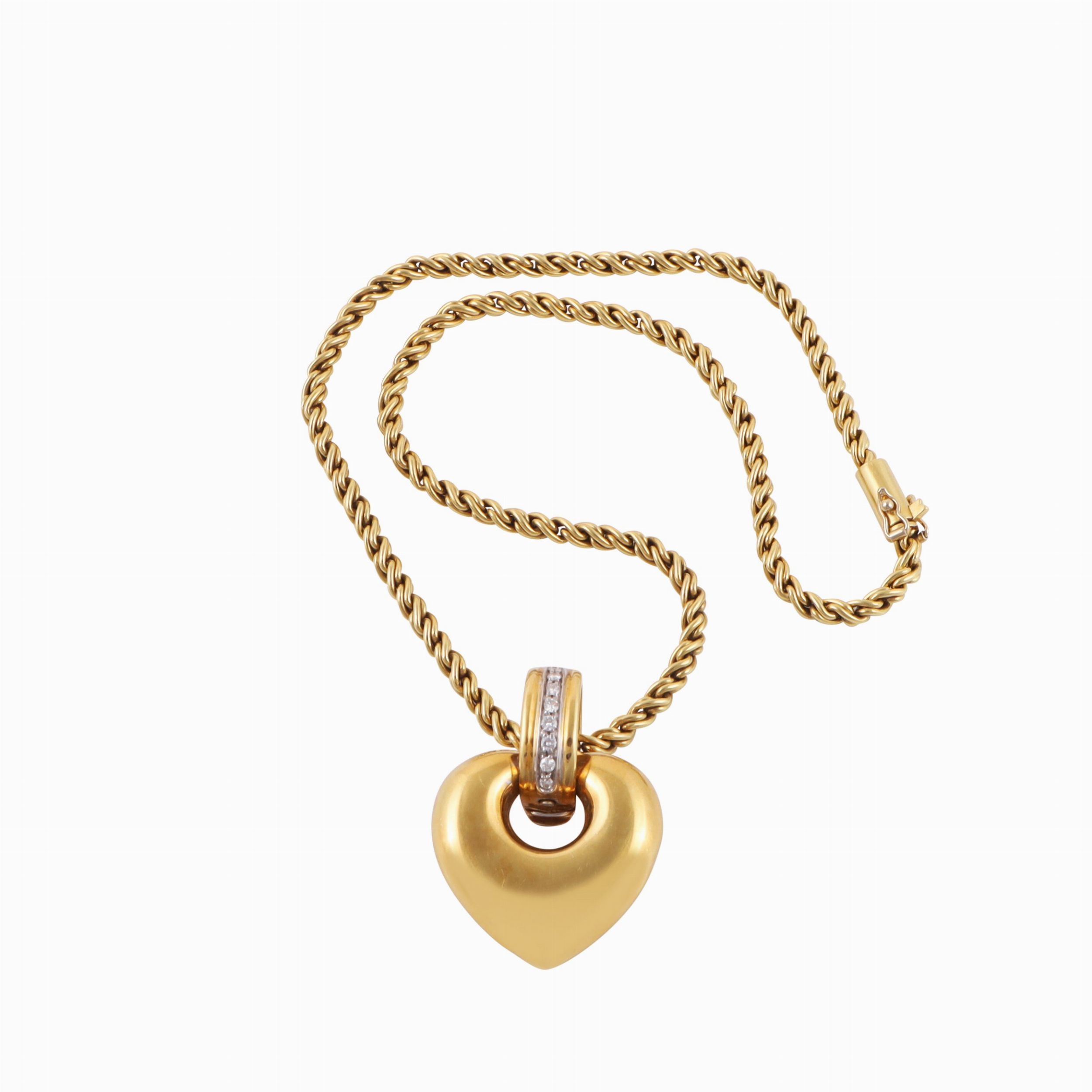 pendente in oro giallo e bianco a forma di cuore con maglia ornata da piccoli brillanti disposti in linea, sostenuto da girocollo a cordoncino in oro giallo, gr. complessivi 55,8. Dimensioni pendente 4 x 3 cm ca. Lunghezza 40 cm