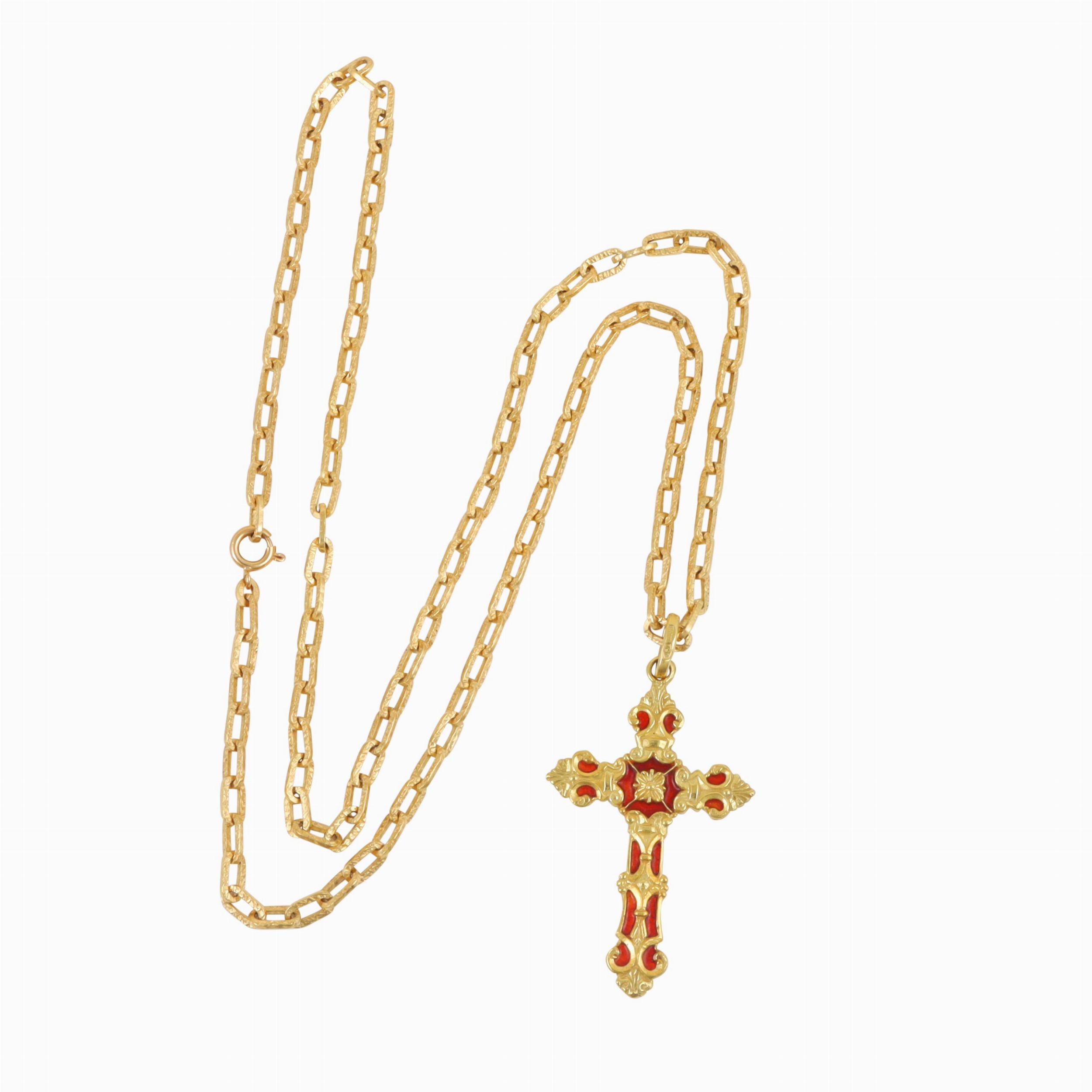 catena in oro giallo a lavorazione martellata con pendente a croce in oro giallo e smalti, gr. complessivi 36,5. Lunghezza catena 64 cm