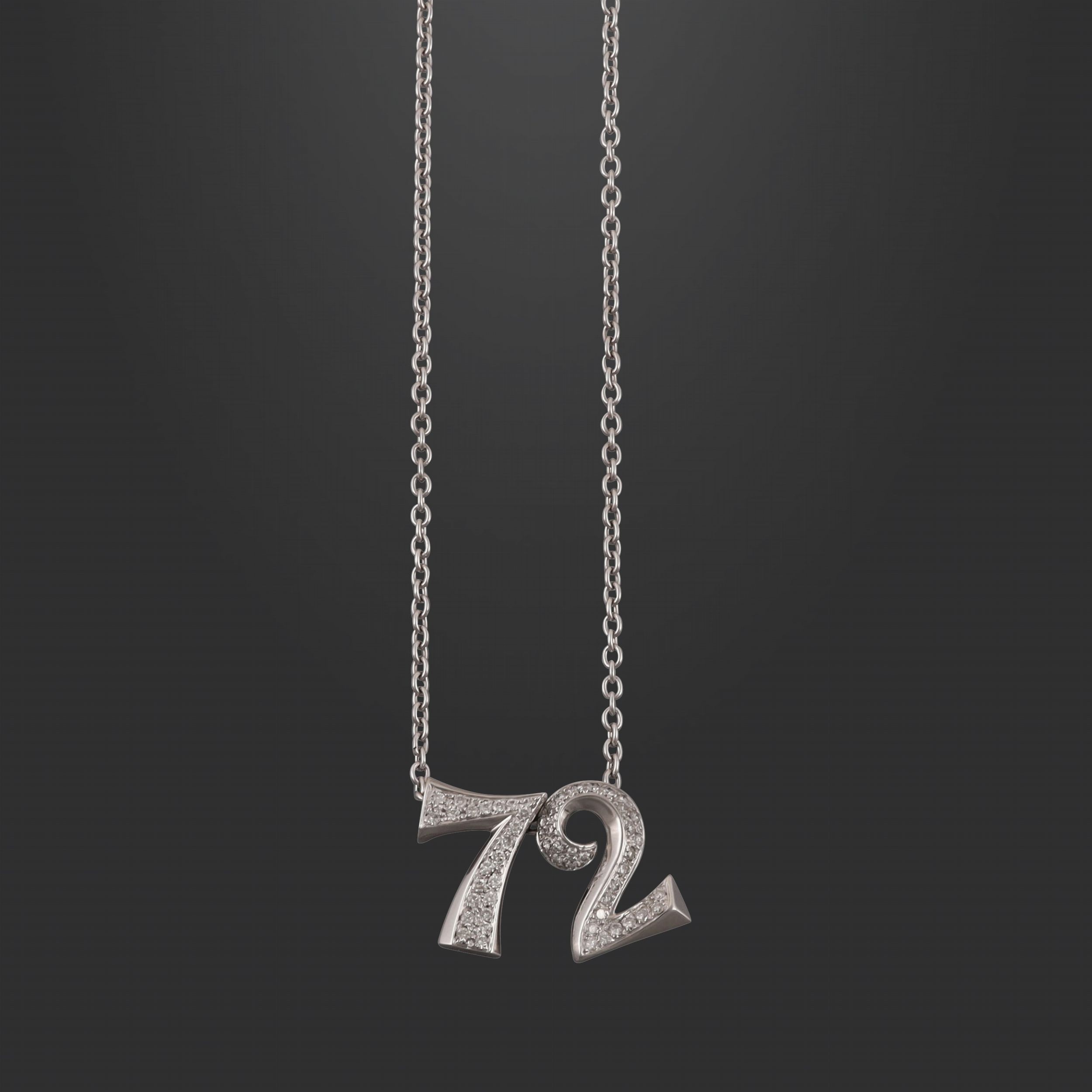 catena girocollo con motivo centrale scorrevole raffigurante il numero 72 in brillanti del peso complessivo di 1 ct ca., gr. 23,3. Lunghezza 49,5 cm (regolabile)