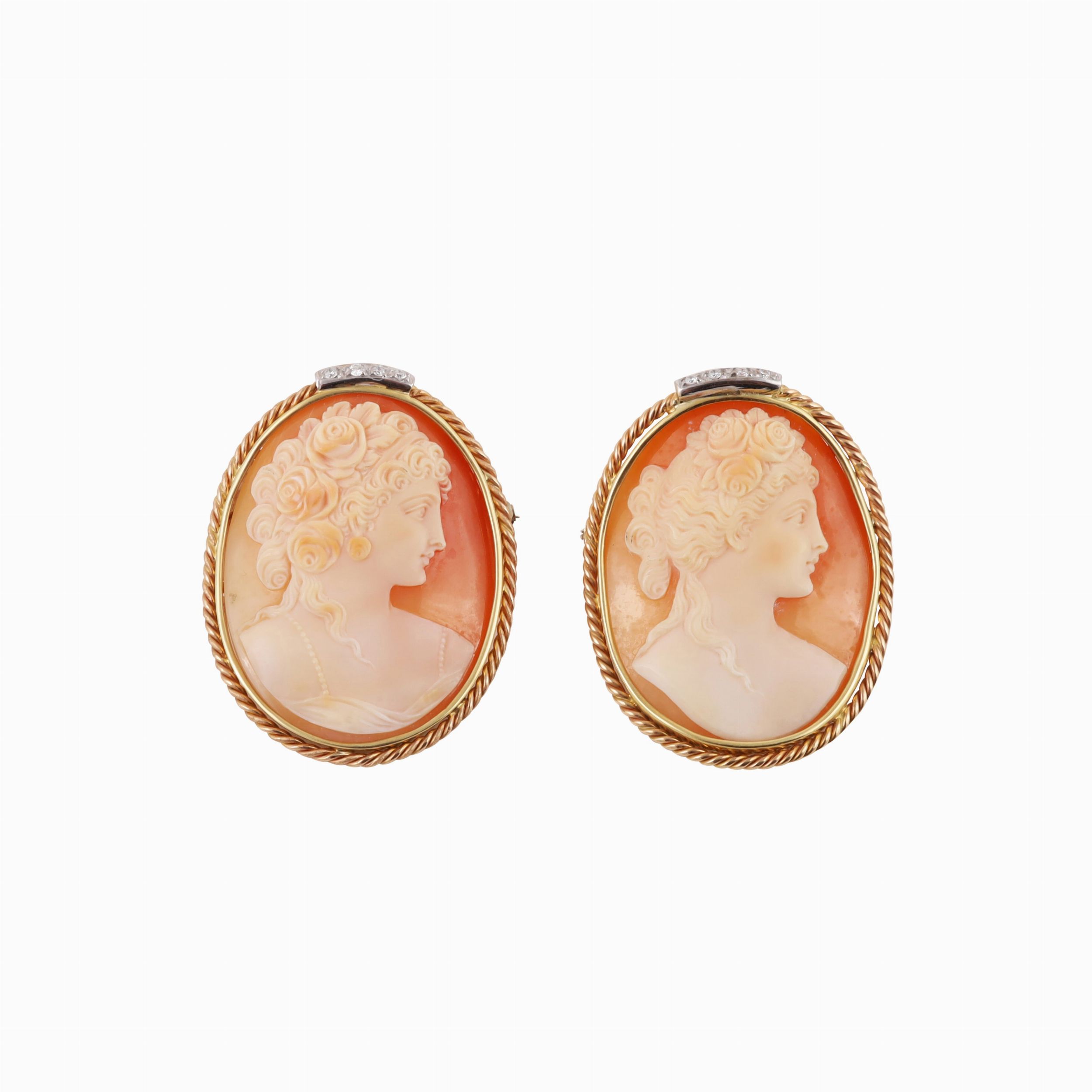 doppio uso, in oro giallo e bianco, ciascuna con cammeo di conchiglia raffigurante un profilo muliebre e piccoli brillanti. Dimensione 4,5 x 3,5 cm ca.