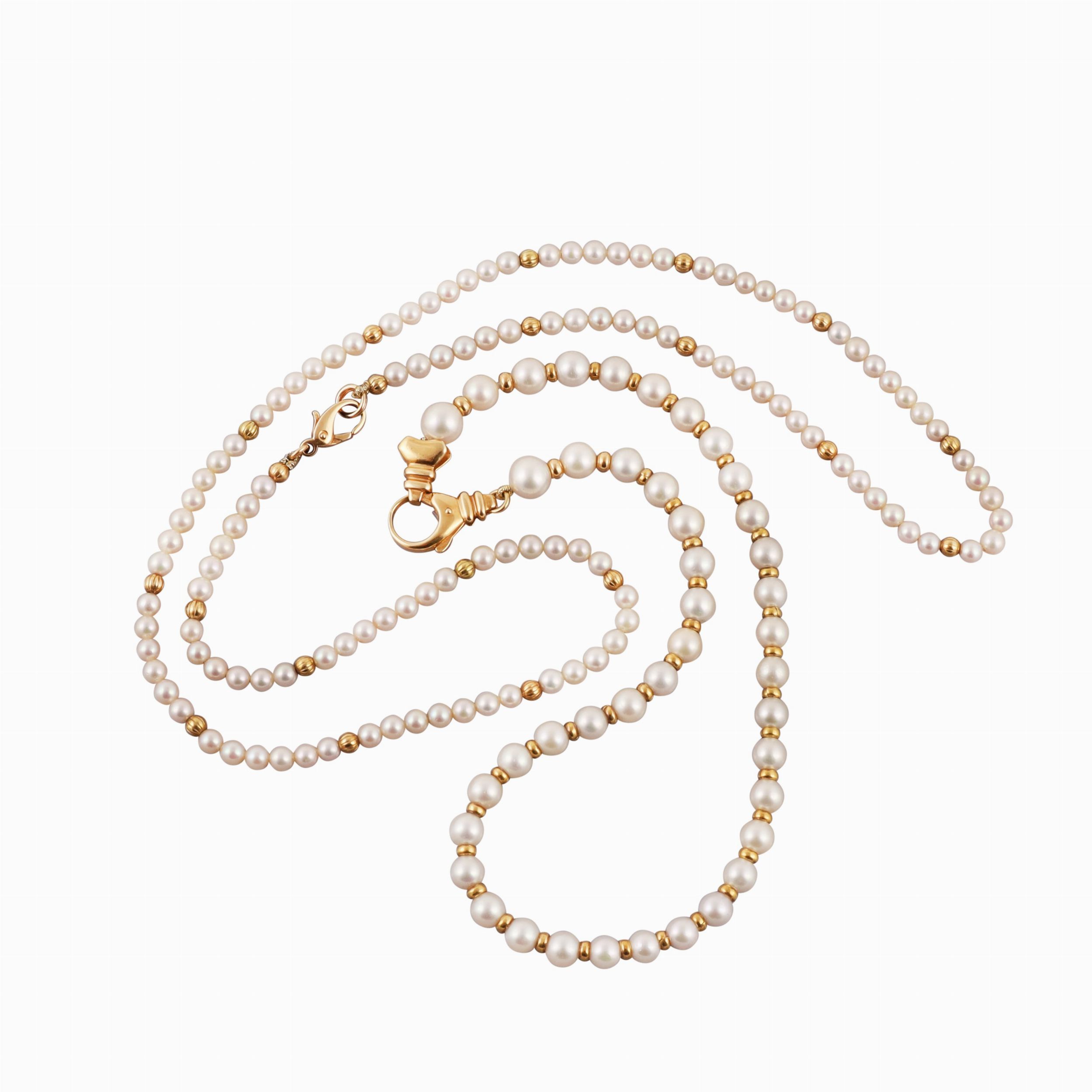 ciascuna a un filo di perle coltivate inframezzate da sferette in oro giallo, chiusure a moschettone. Lunghezza 65,5 cm e 38 cm