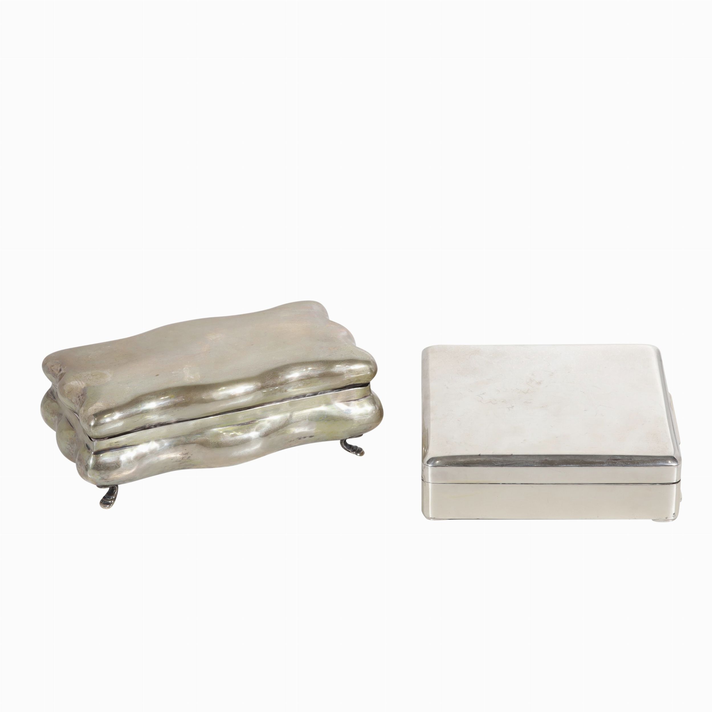 rispettivamente a forma quadrata in argento 925 liscio con coperchio, gr. 480 ca. e a forma rettangolare in argento 800 con baccellature, poggiante su piedini, quest'ultima riporta impresso il numerario 47 PD corrispondente all'Argenteria 'S. Marco' di Vittorio Minozzi - Padova, gr. 440 ca. Dimensioni 15 x 15 (h) 5 cm ca. e 18 x 10 (h) 6,5 cm ca.
