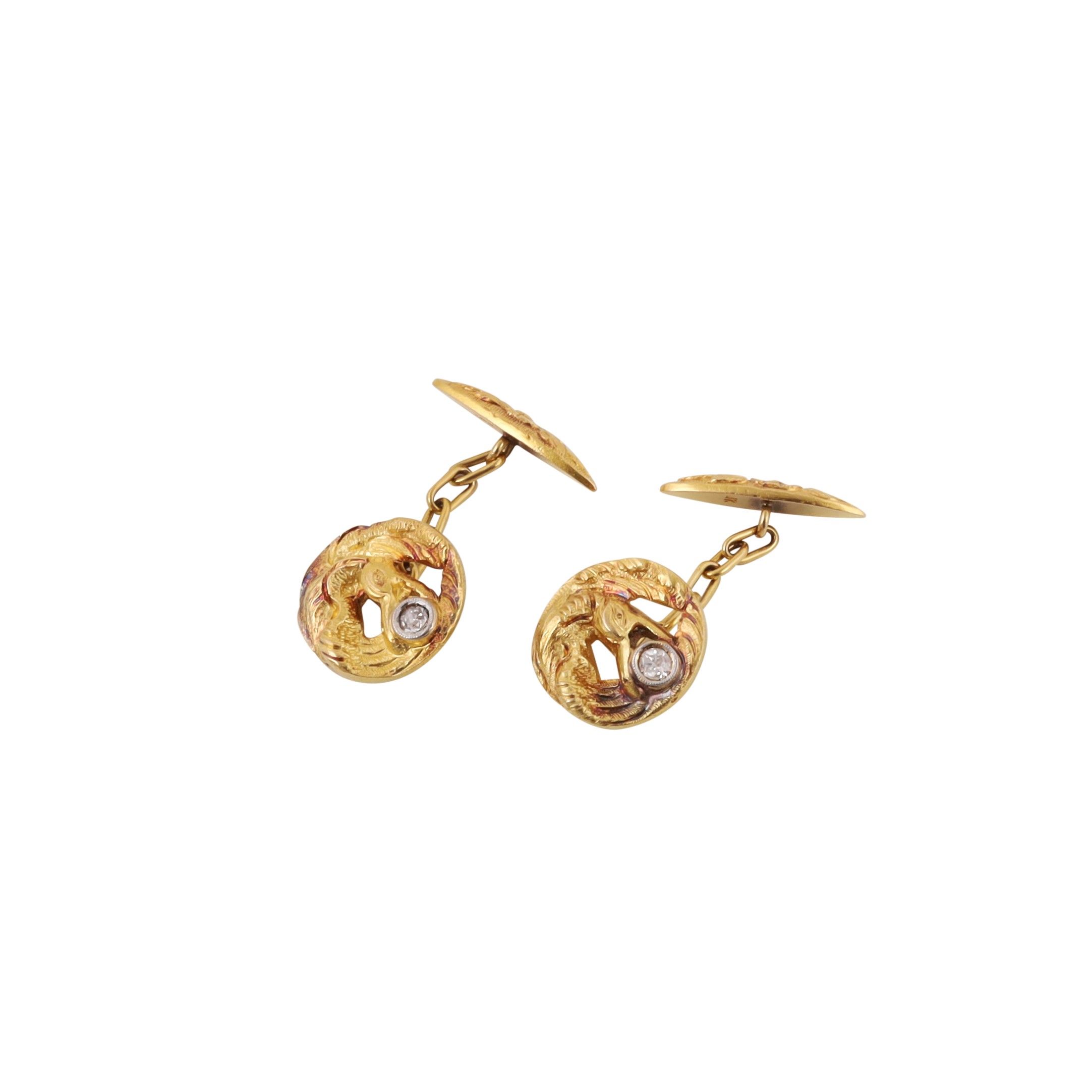 in oro giallo a forma circolare traforati raffiguranti un uccello fantastico con brillanti, gr. 11,1.