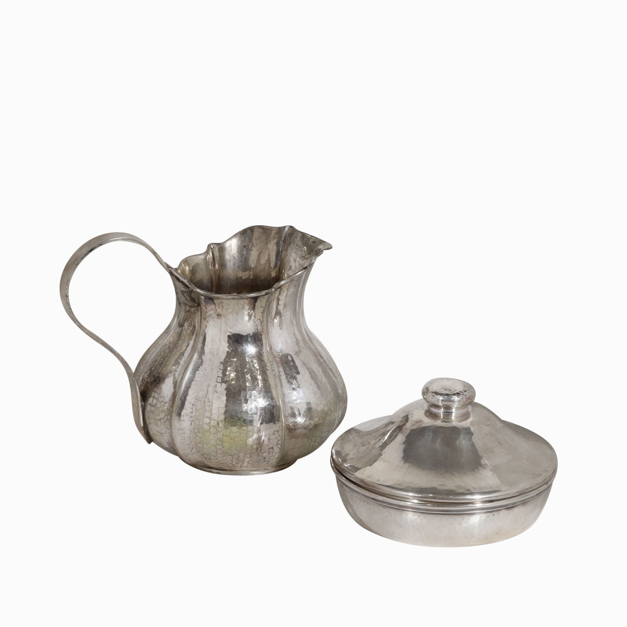 piccolo portavivande in argento 925 con coperchio, corpo circolare a lavorazione martellata, gr. 360 ca., all'interno ciotola in porcellana bianca. Brocca in argento 800, corpo espanso costolato a lavorazione martellata con manico a nastro, gr. 480 ca. Diametro portavivande 15 cm (h) 8 cm ca.; brocca 15 (h) 14 cm ca. Numerario: portavivande 246 MI (Curti Argenteria - Milano); brocca 33 PD (Ghiraldin Ugo - Padova)