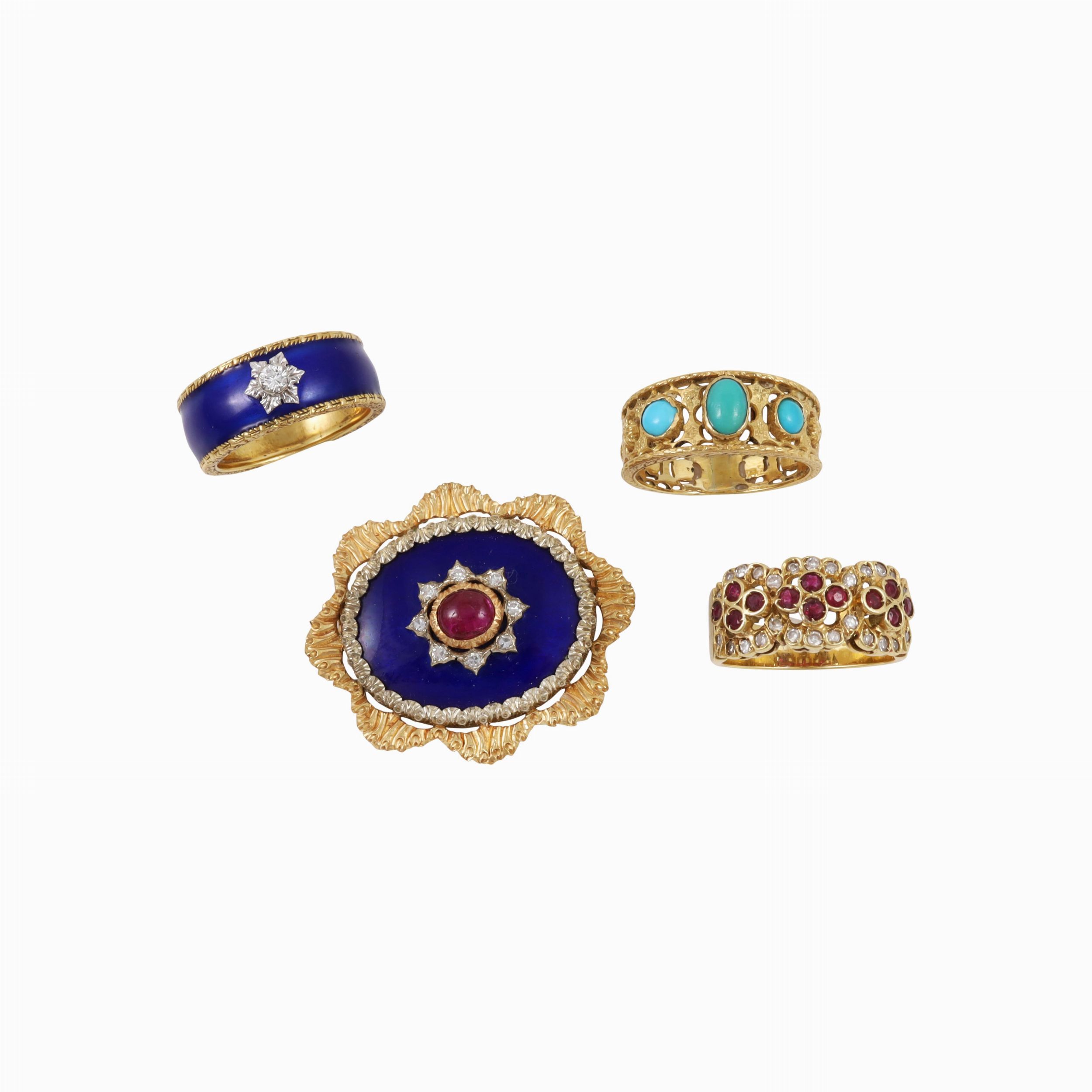in oro. Composto da tre anelli, rispettivamente con smalto blu e piccolo diamante, con rubini e piccoli diamanti e con tre turchesi; spilla a forma ovale lobata incisa con smalto blu, rubino taglio cabochon e piccoli diamanti, gr. complessivi 32,5. Misura anelli 11, 12, 14 Misure spilla 3,3 x 2,8 cm ca.