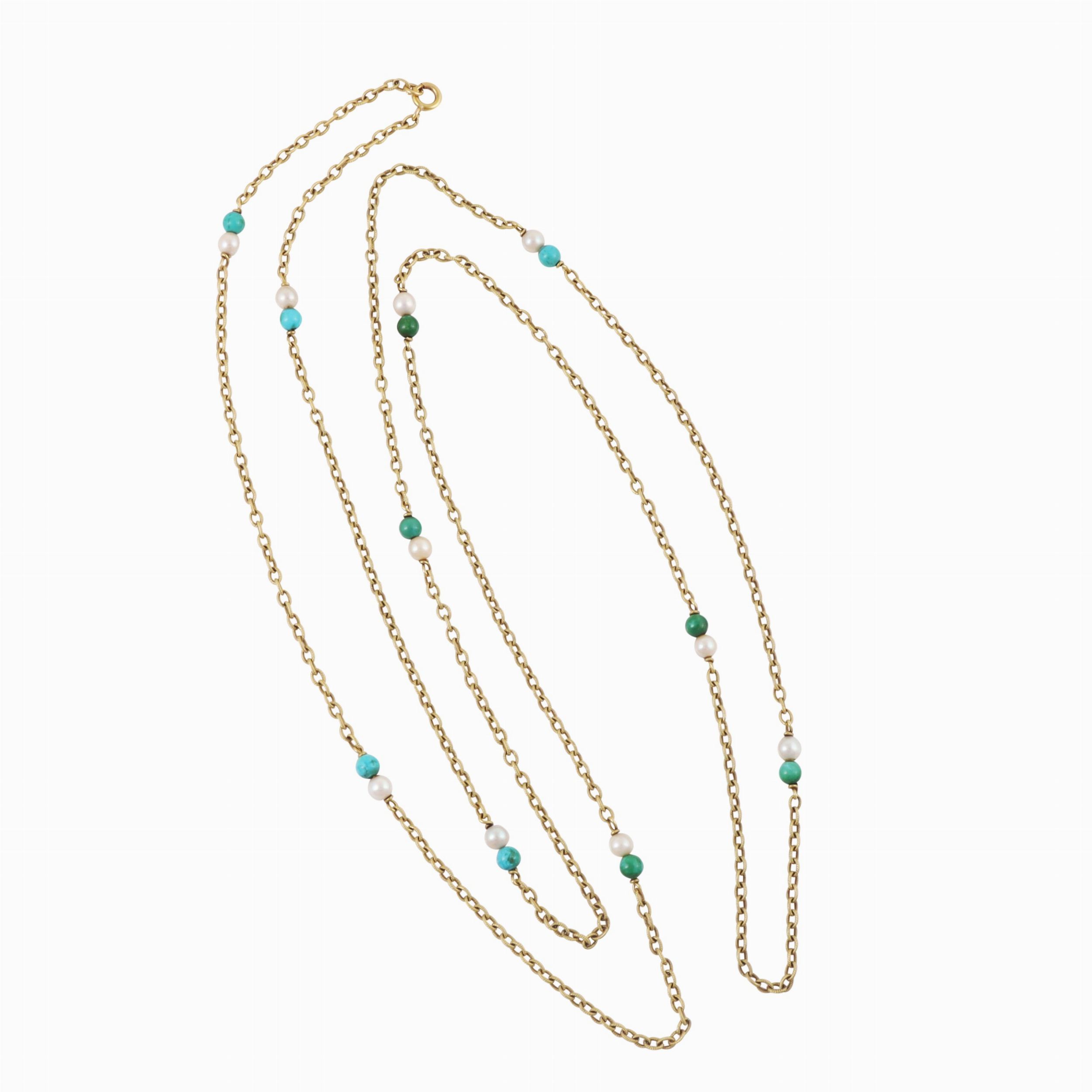 in oro giallo con maglie ovali a filo ritorto, intercalata da sfere di turchese e perle coltivate, gr. 29,8. Lunghezza 126 cm