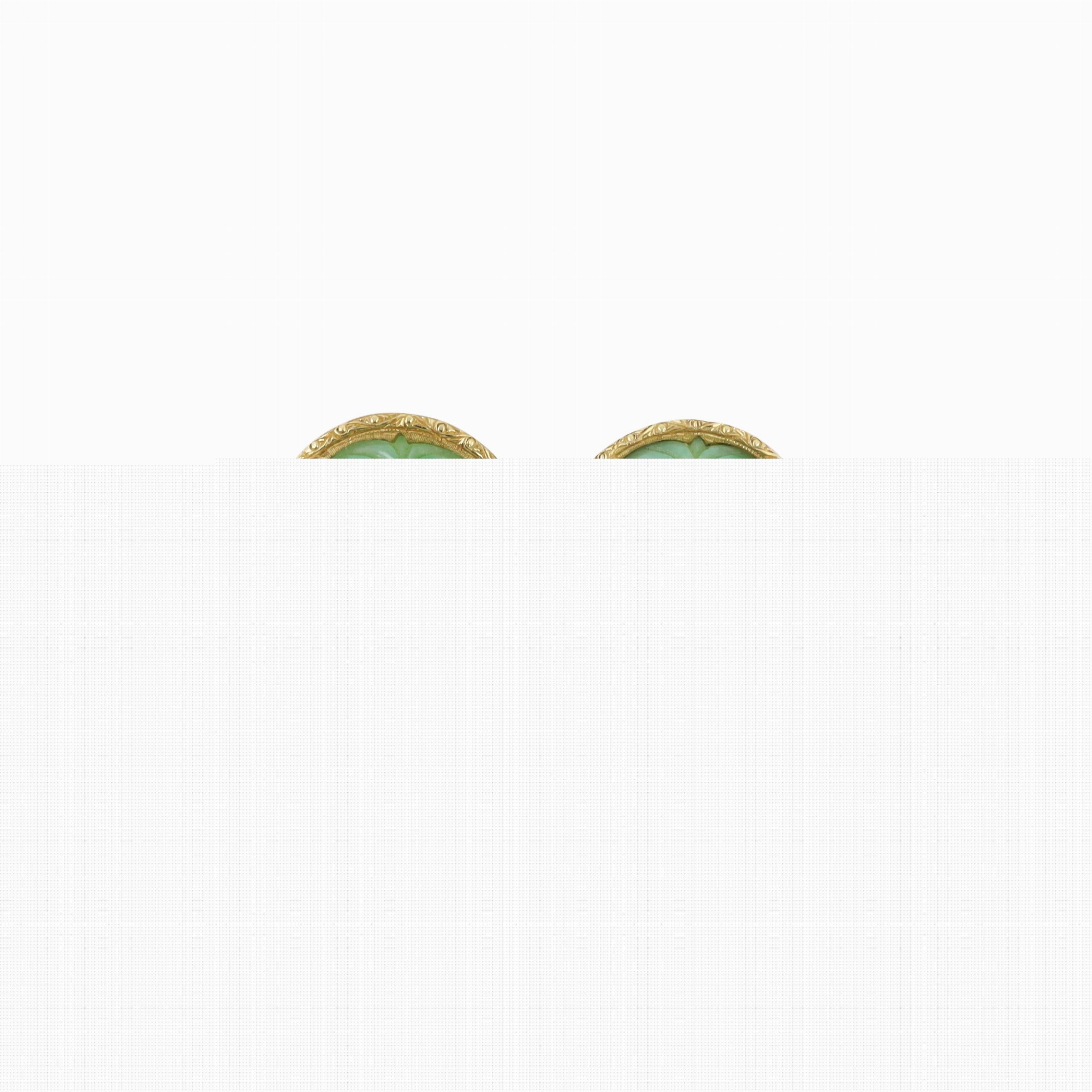 a clip in oro giallo, ciascuno con giadeite tonda incisa a motivi vegetali, gr. 24,3. Diametro 2,5 cm ca.