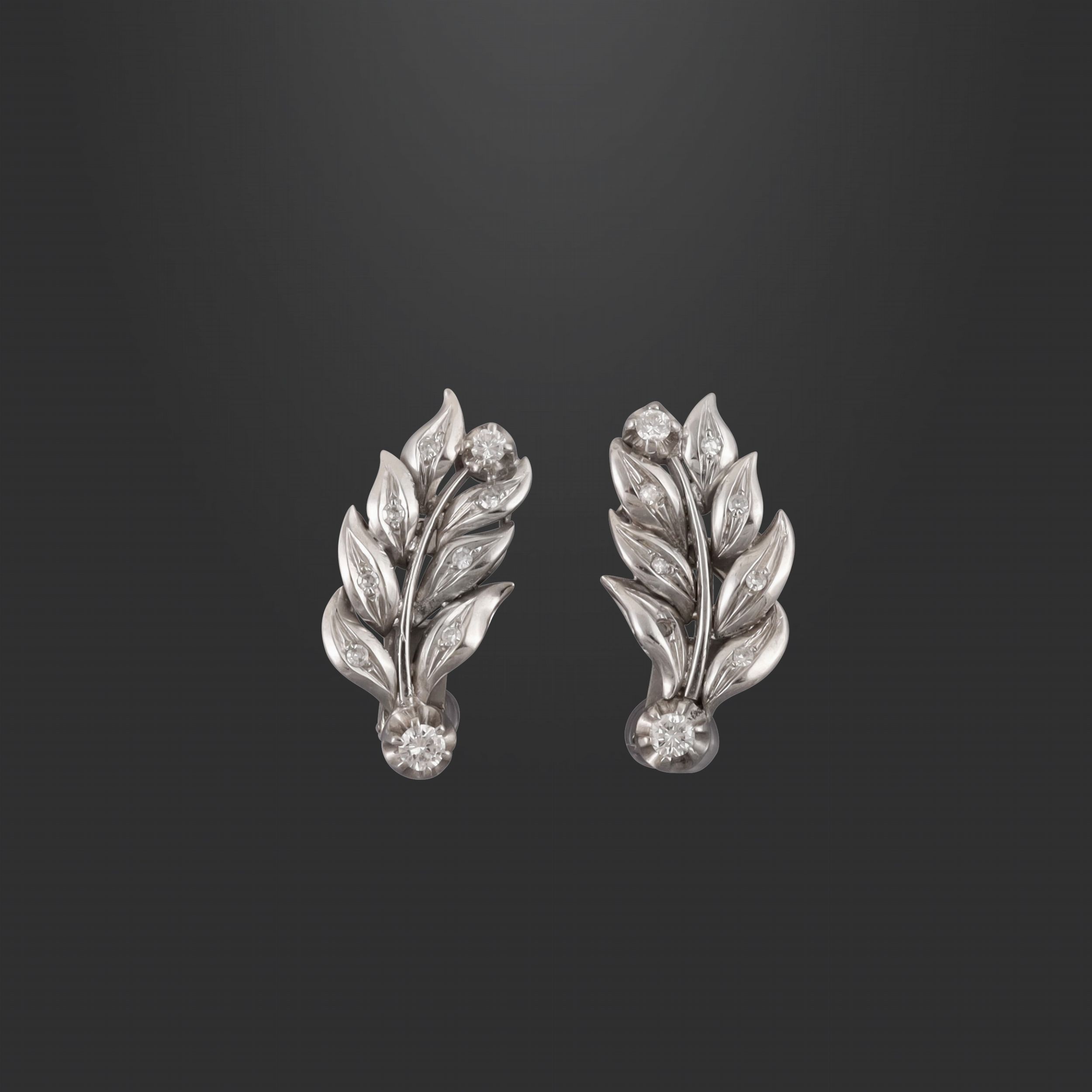 clip in oro bianco a motivi fogliati, ornati da brillanti, gr. 11,6. Dimensioni 3 x 1,4 cm ca.