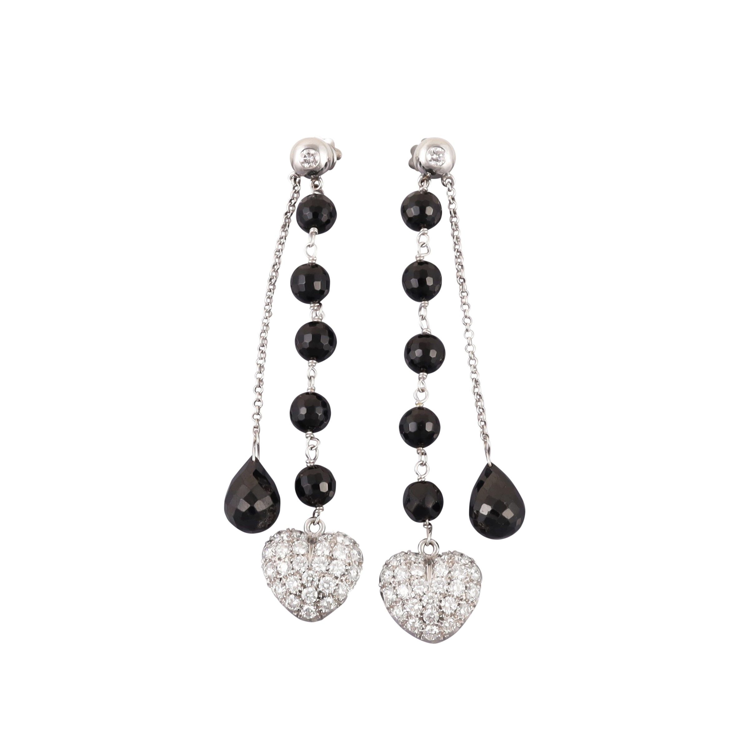 pendenti in oro bianco con onici, ciascuno con un cuore in pavé di brillanti terminale, gr. 16,2. Brillanti del peso complessivo di 2,50 ct ca. Lunghezza 8 cm ca.