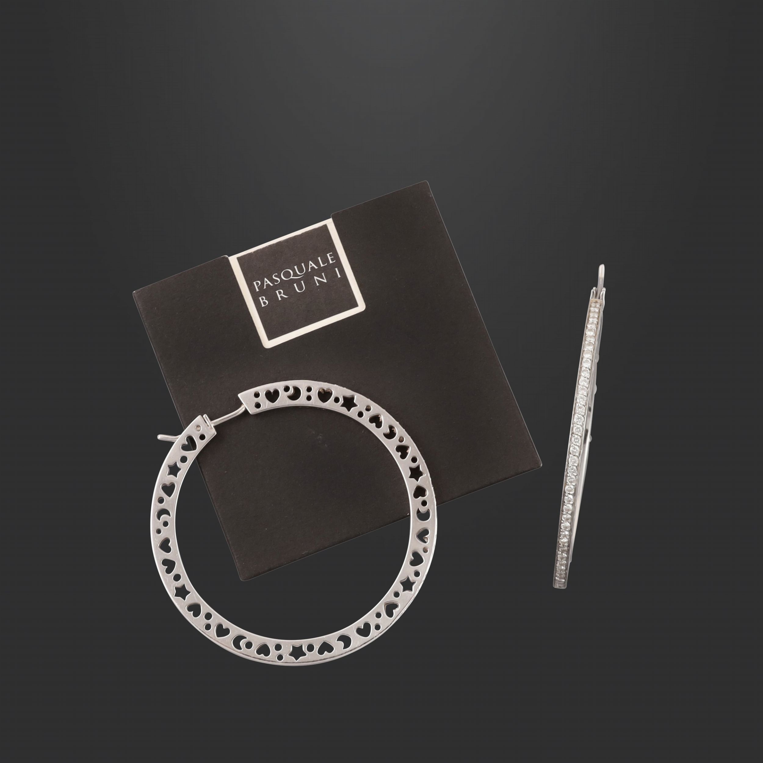 cerchi in oro bianco traforati, percorsi anteriormente da brillanti del peso complessivo di 0,80 ct ca., gr. 18,8. Corredati da custodia originale e certificato di garanzia della Maison. Diametro 4,3 cm ca. Firmati: PB