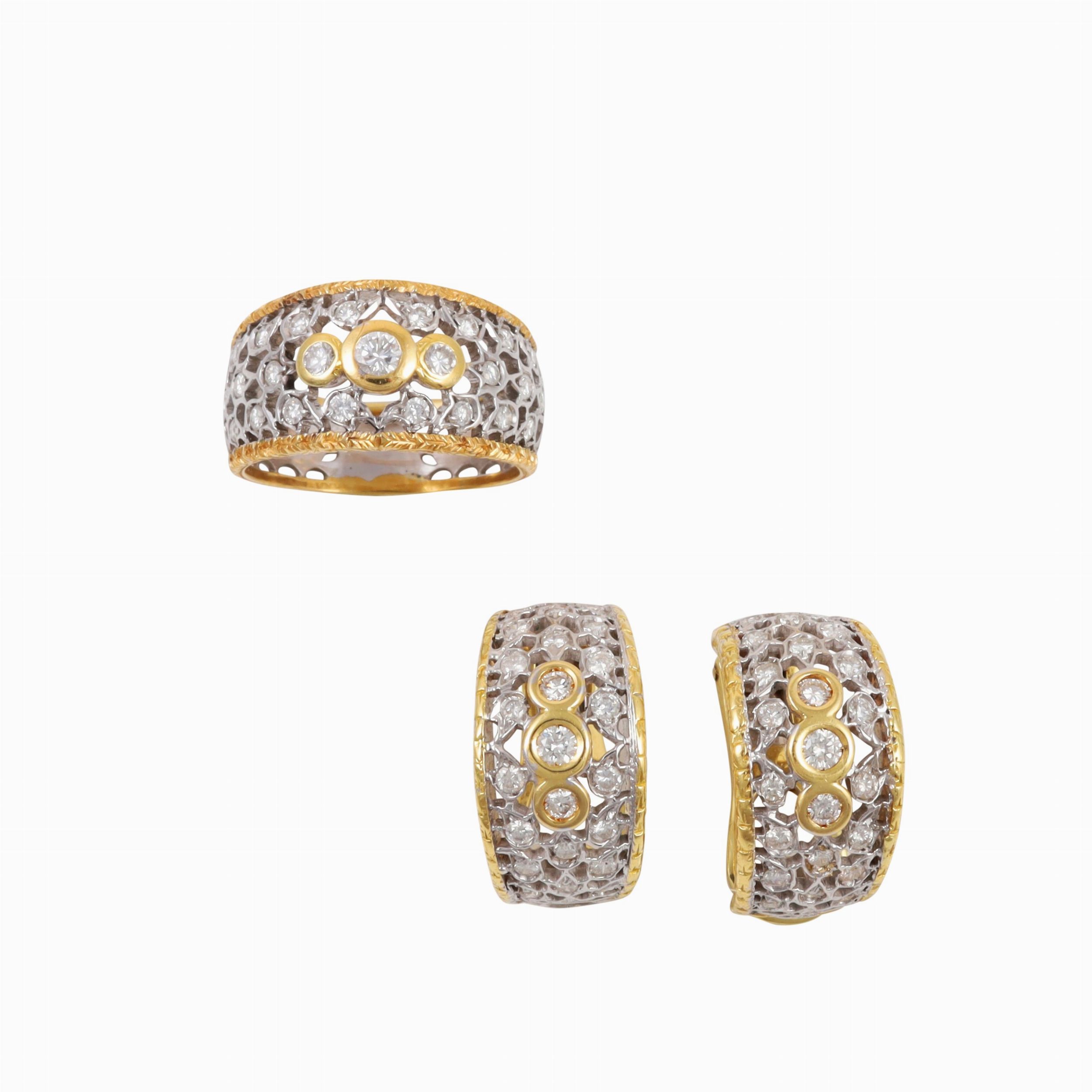 composta da anello e orecchini a clip, realizzati in oro giallo e bianco traforati e cesellati a motivi vegetali, impreziositi da brillanti, gr. complessivi 21,1. Misura anello 20