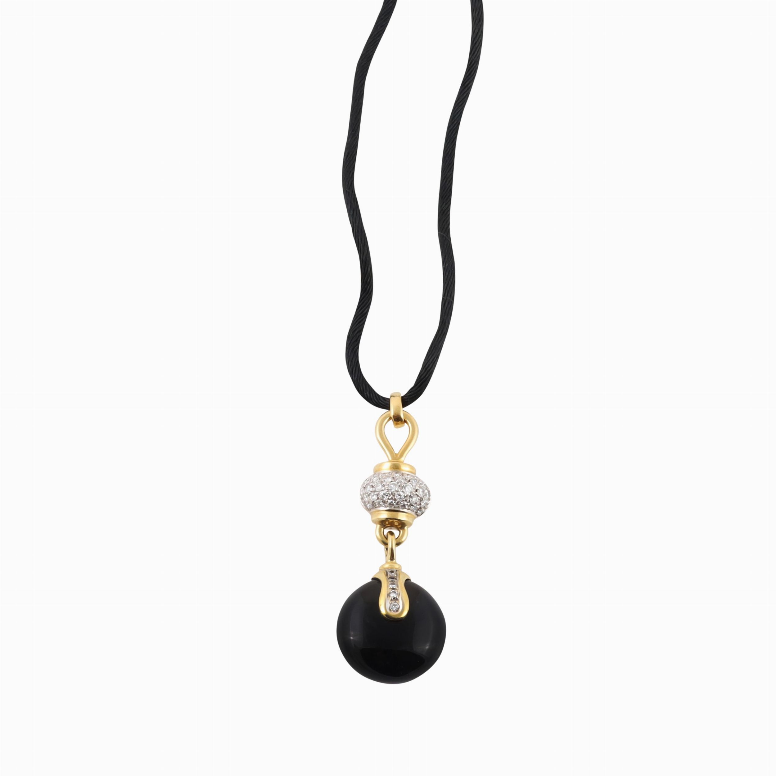 in oro giallo e bianco con motivo a semisfera in pavé di brillanti a sostegno di un'onice tonda, gr. 9,6. Lunghezza 5 x 1,7 cm ca.