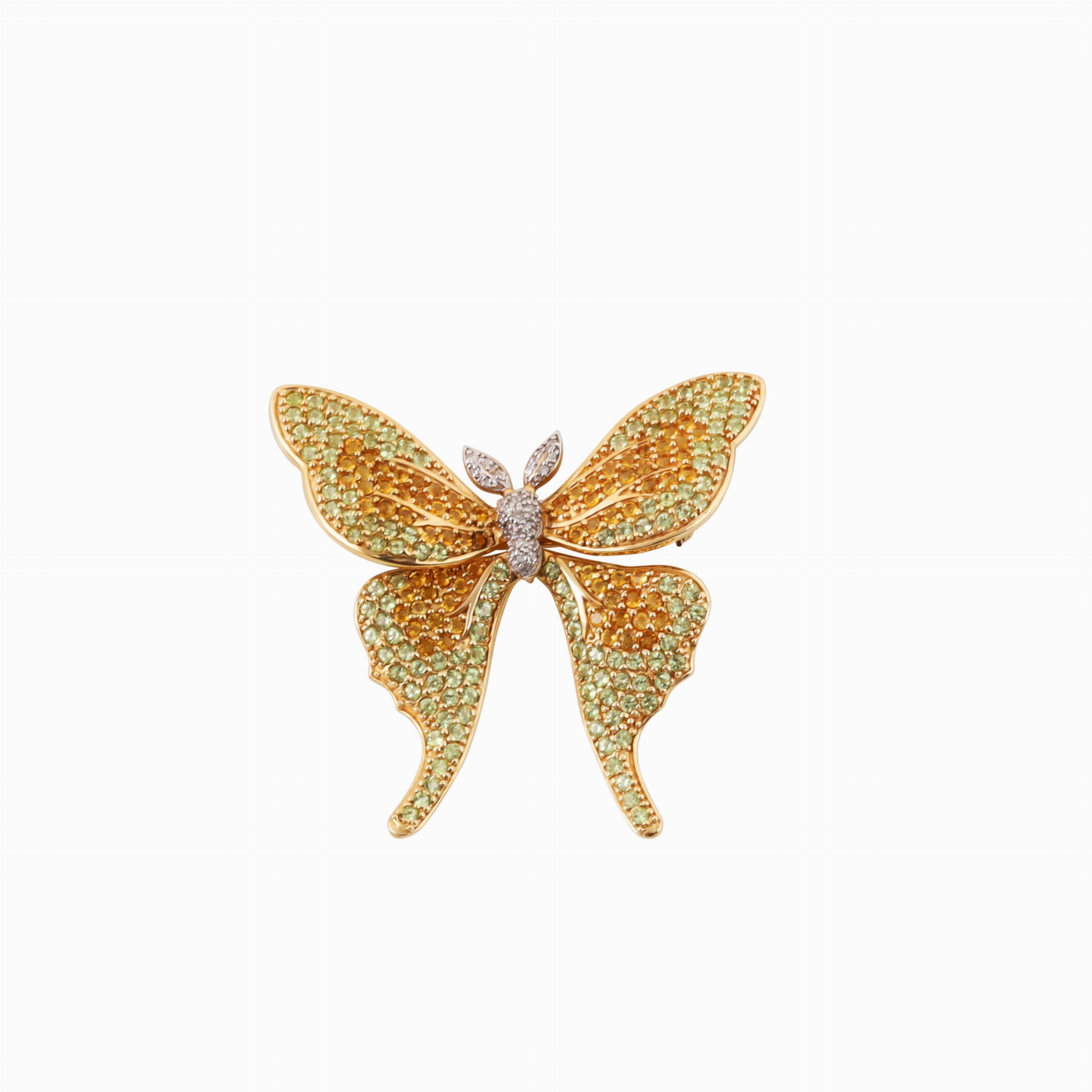 doppio uso, in oro a titolo basso, raffigurante una farfalla con ali inferiori 'en tremblant', ornata da quarzi e diamanti, gr. 13,8. Dimensioni 5,2 x 5 cm ca.