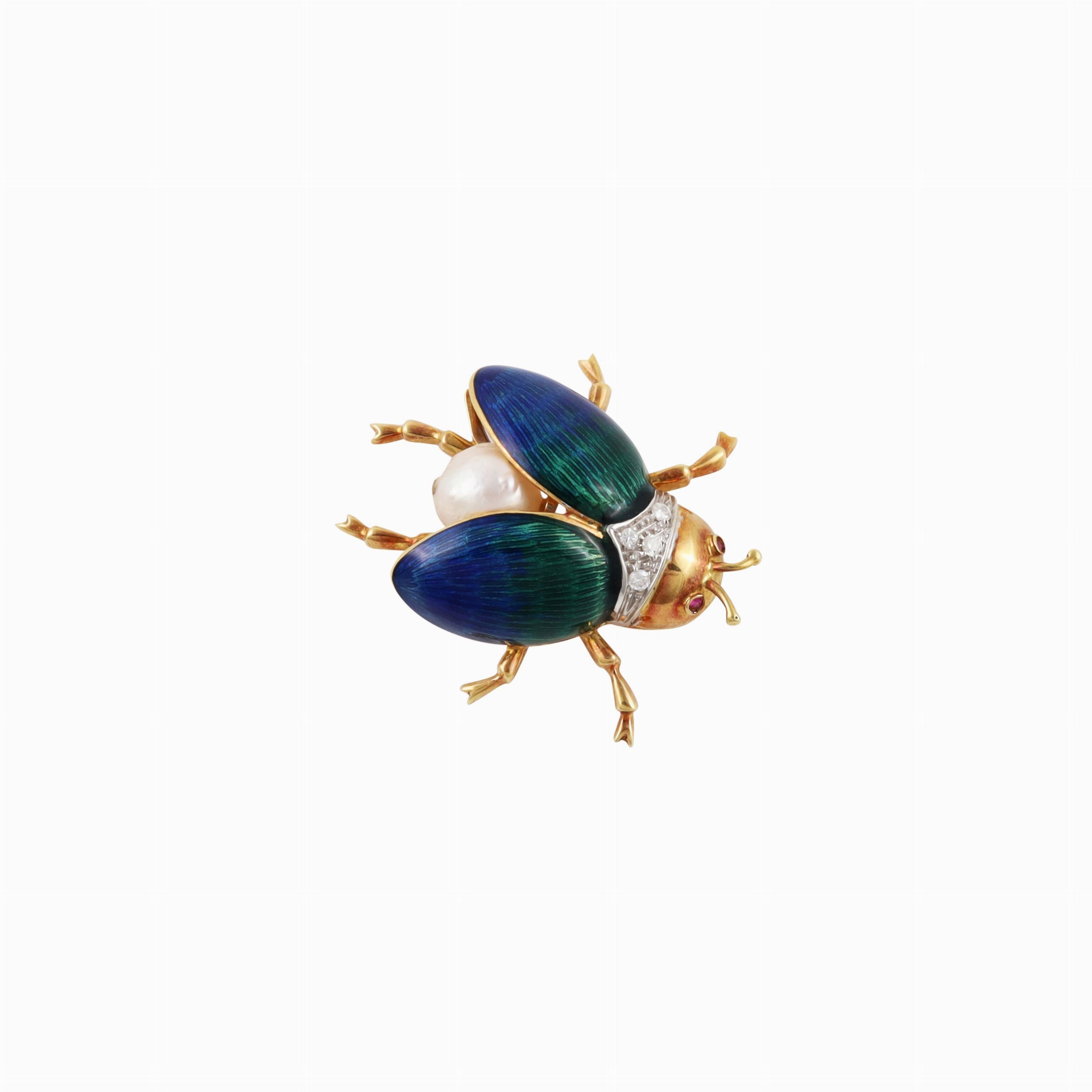 in oro giallo a guisa di maggiolino con ali in smalti policromi, ornata da brillanti, perla coltivata e rubini, gr. 13,5. Dimensioni 3,5 x 3 cm ca.