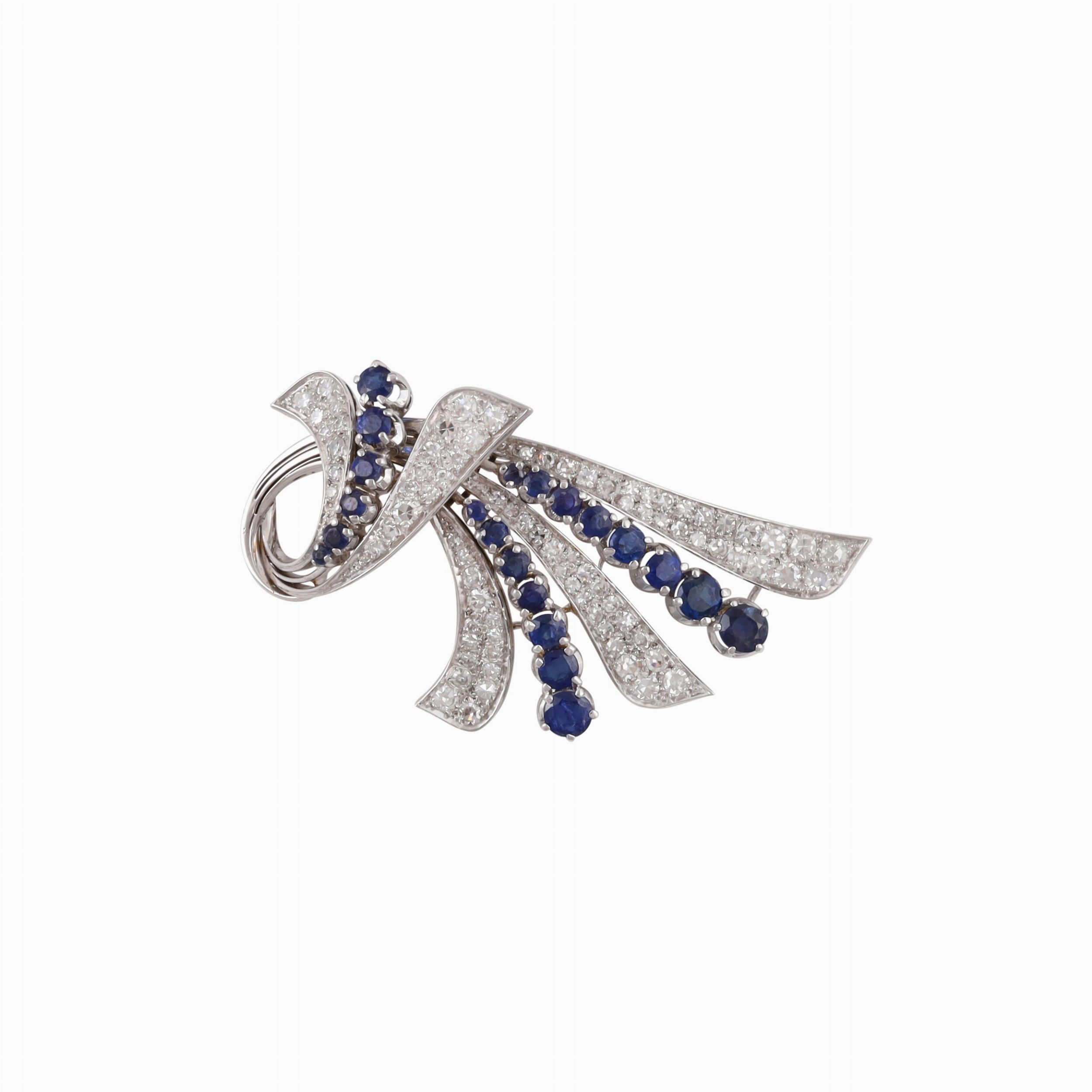in oro bianco a volute con diamanti e zaffiri, gr. 10,4. Dimensioni 5 x 2,5 cm