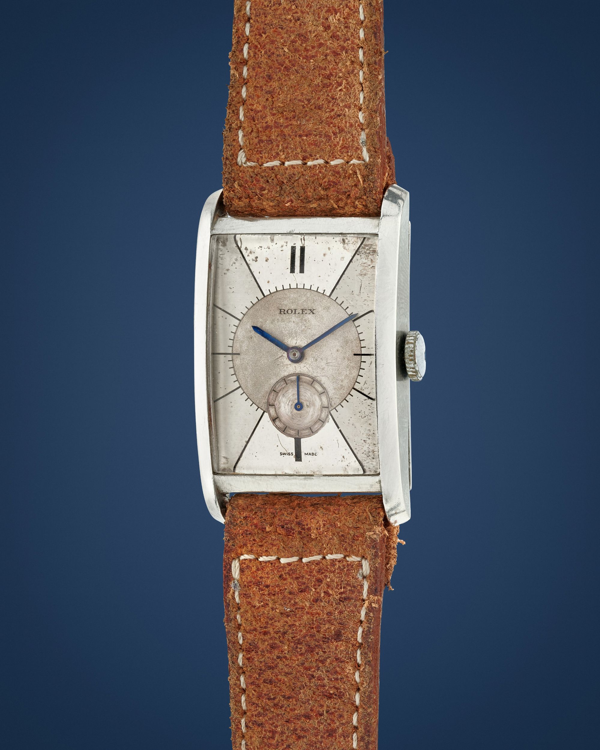 anni 30 Cassa rettangolare in acciaio, n.013511. Quadrante a settori argenté a tre toni, indici dipinti. Movimento a carica manuale. Cinturino in pelle. Dimensioni: 43 x 26 mm.