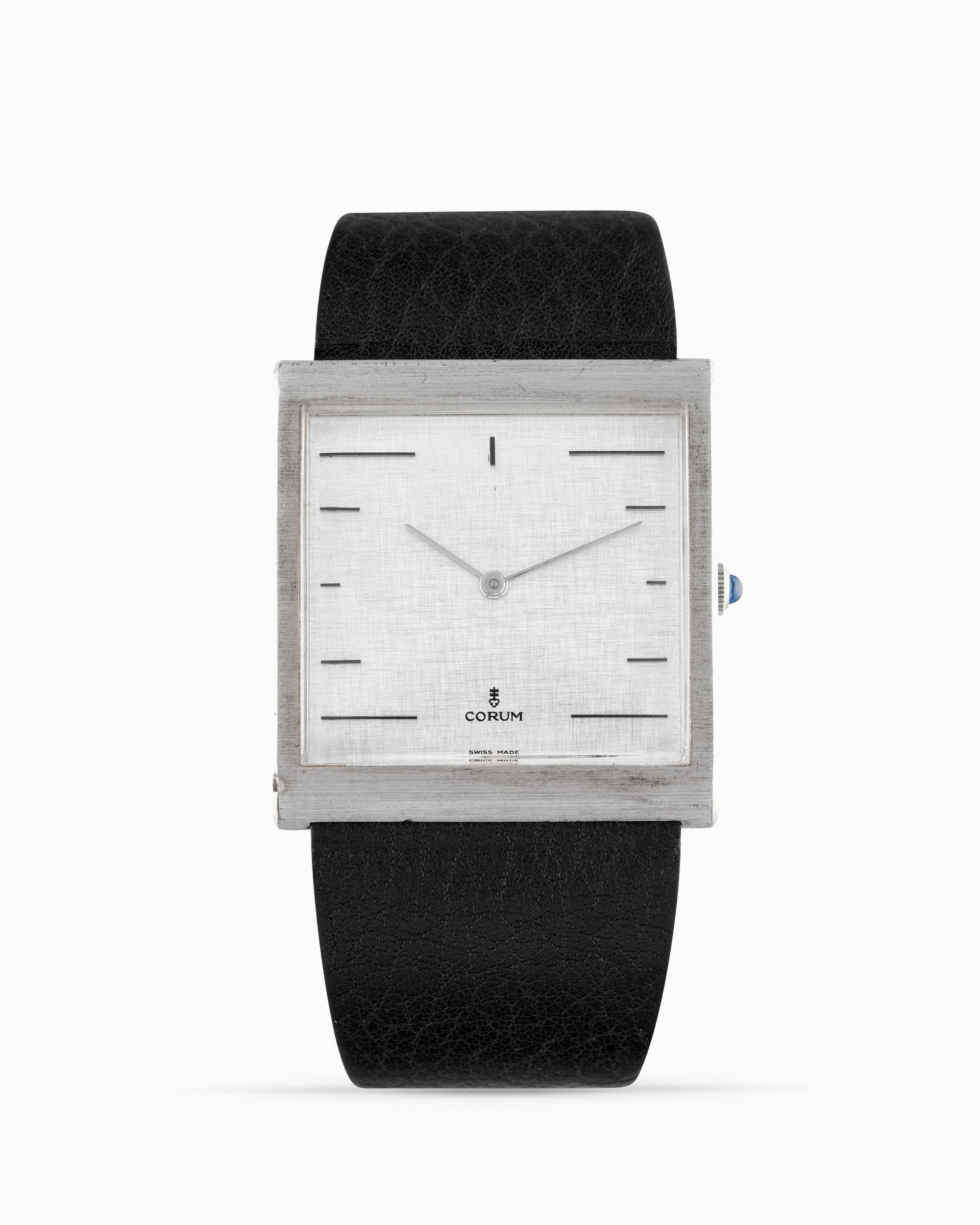 anni 70 Cassa rettangolare in argento. Quadrante argenté con finitura lino, indici applicati. Movimento a carica manuale. Cinturino Corum in pelle e fibbia Corum in acciaio. Dimensioni: 36 x 38 mm. Accompagnato da pochette e scatola Corum.