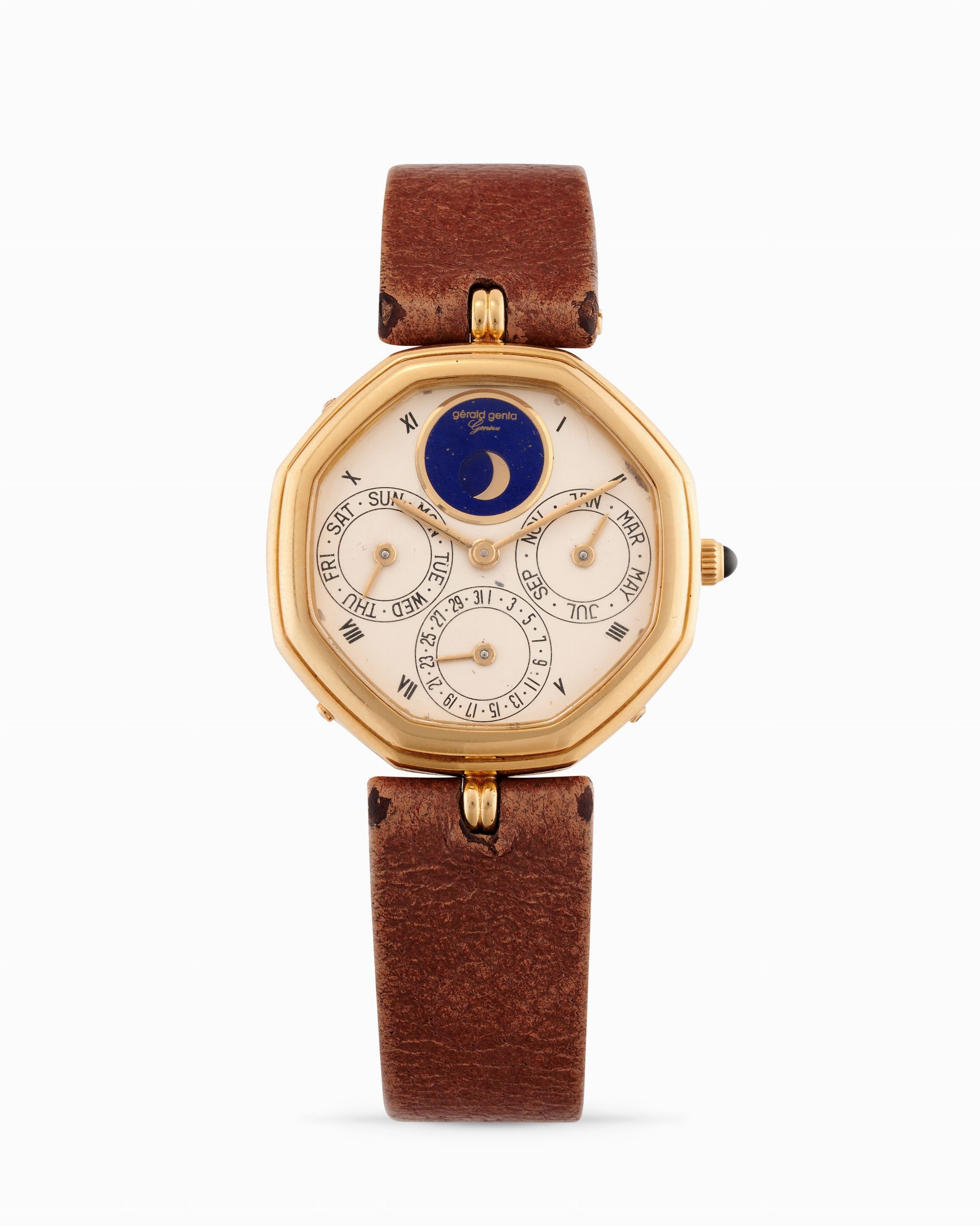 anni 80 Cassa ottagonale in oro 18k, n.26534, anse Vendôme. Quadrante bianco con disco in lapislazzuli attorno alle fasi lunari, indicazione della data, giorno della settimana e mese. Movimento a carica automatica, cal.217. Cinturino in pelle e fibbia Gérald Genta in oro. Dimensioni: 31 mm. Accompagnato da garanzia Gérald Genta.
