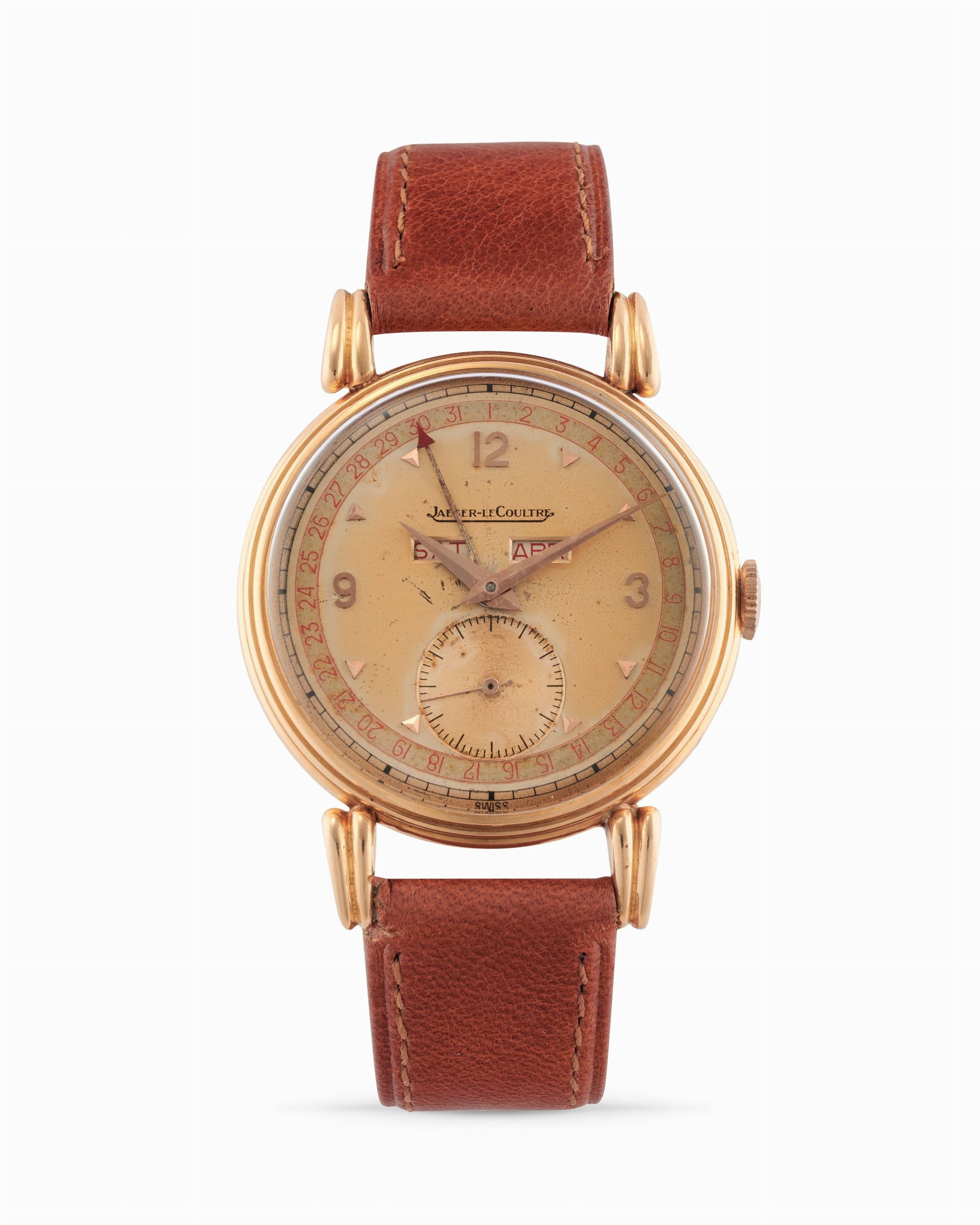 anni 50 Cassa rotonda a gradini in oro rosa 18k, n.419019, anse a fiamma. Quadrante color crema a due toni, indici e numeri arabi applicati, indicazione della data, giorno della settimana e mese. Movimento a carica manuale, cal.P484. Cinturino in pelle. Dimensioni: 36 mm.