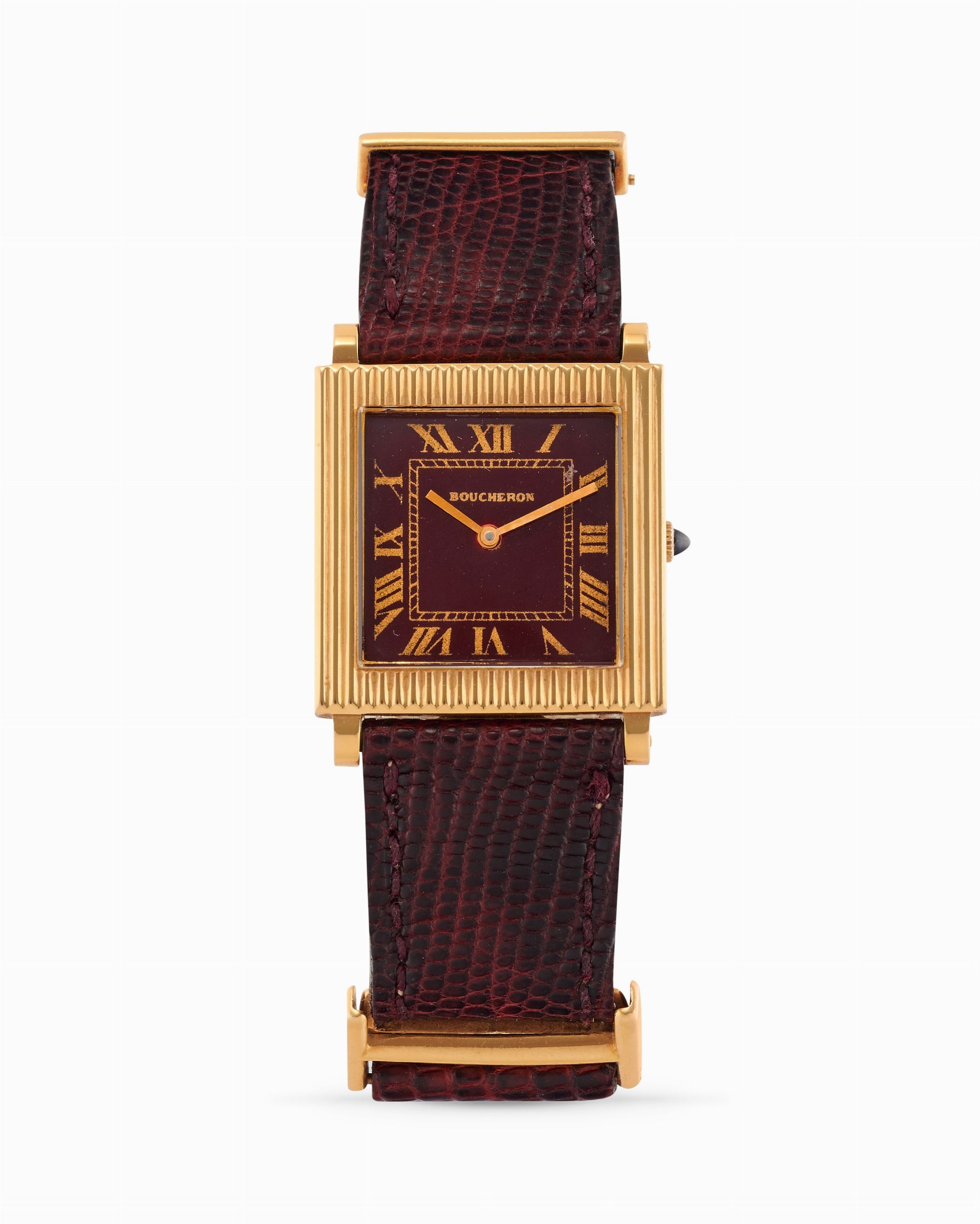 anni 70 Cassa quadrata in oro 18k con finitura godronata, n.74612. Quadrante in lacca bordeaux, numeri romani dipinti. Movimento al quarzo. Cinturino Boucheron in pelle e fibbie a scorrimento Boucheron in oro. Dimensioni: 23 x 23 mm.