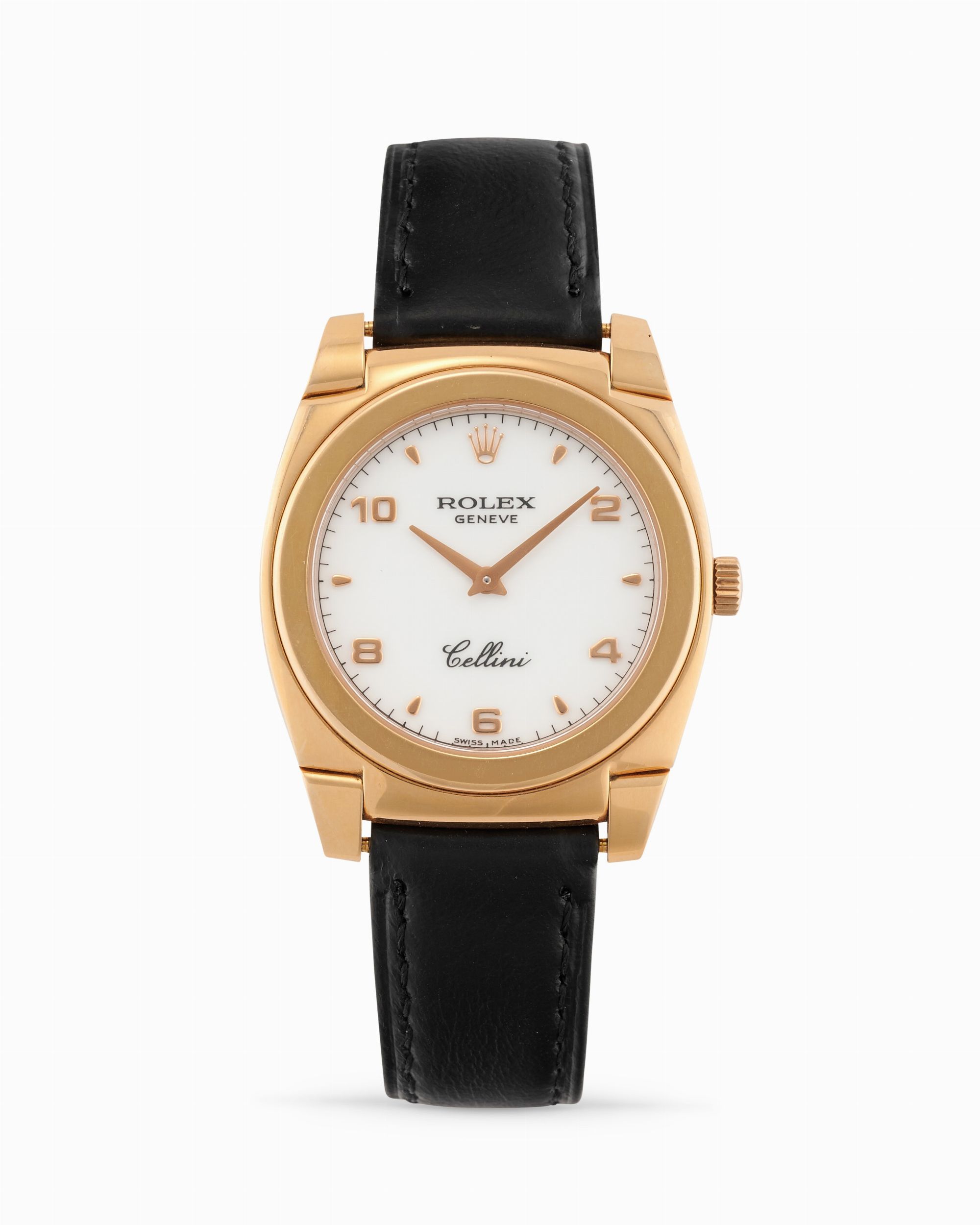 anni 90 Cassa tonneau in oro rosa 18k, n.A843659. Quadrante bianco, numeri arabi e indici applicati. Movimento a carica manuale, cal.1602. Cinturino in pelle e fibbia Rolex in oro. Dimensioni: 34 x 32 mm.