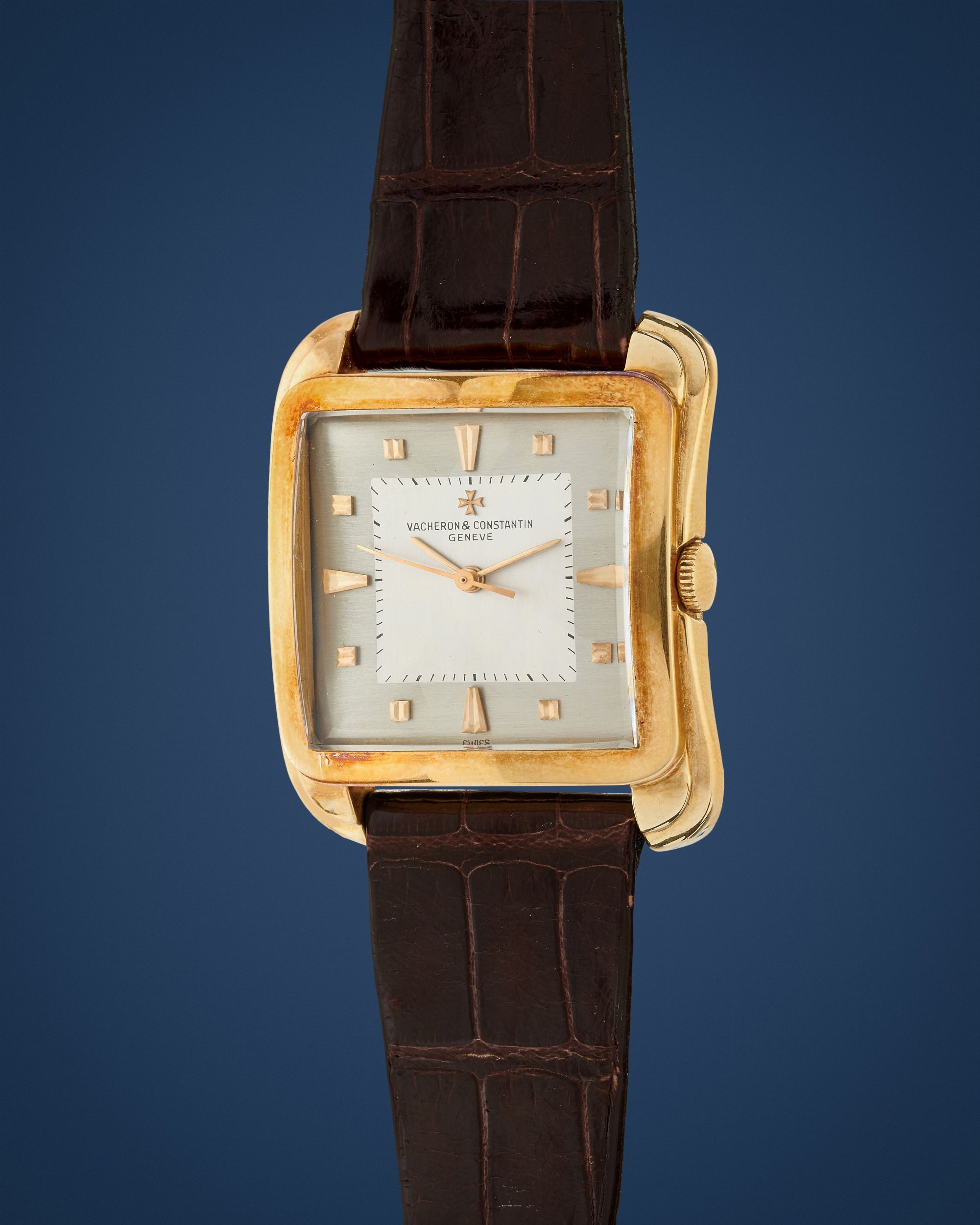 anni 50 Cassa rettangolare arrotondata a gradini in oro 18k, n.362834. Quadrante argenté a due toni, indici applicati. Movimento a carica automatica, cal.P1019/1, n.536709. Cinturino Vacheron Constantin in pelle e fibbia Vacheron Constantin in oro. Dimensioni: 44 x 35 mm. Accompagnato da estratto d'archivio Vacheron Constantin.