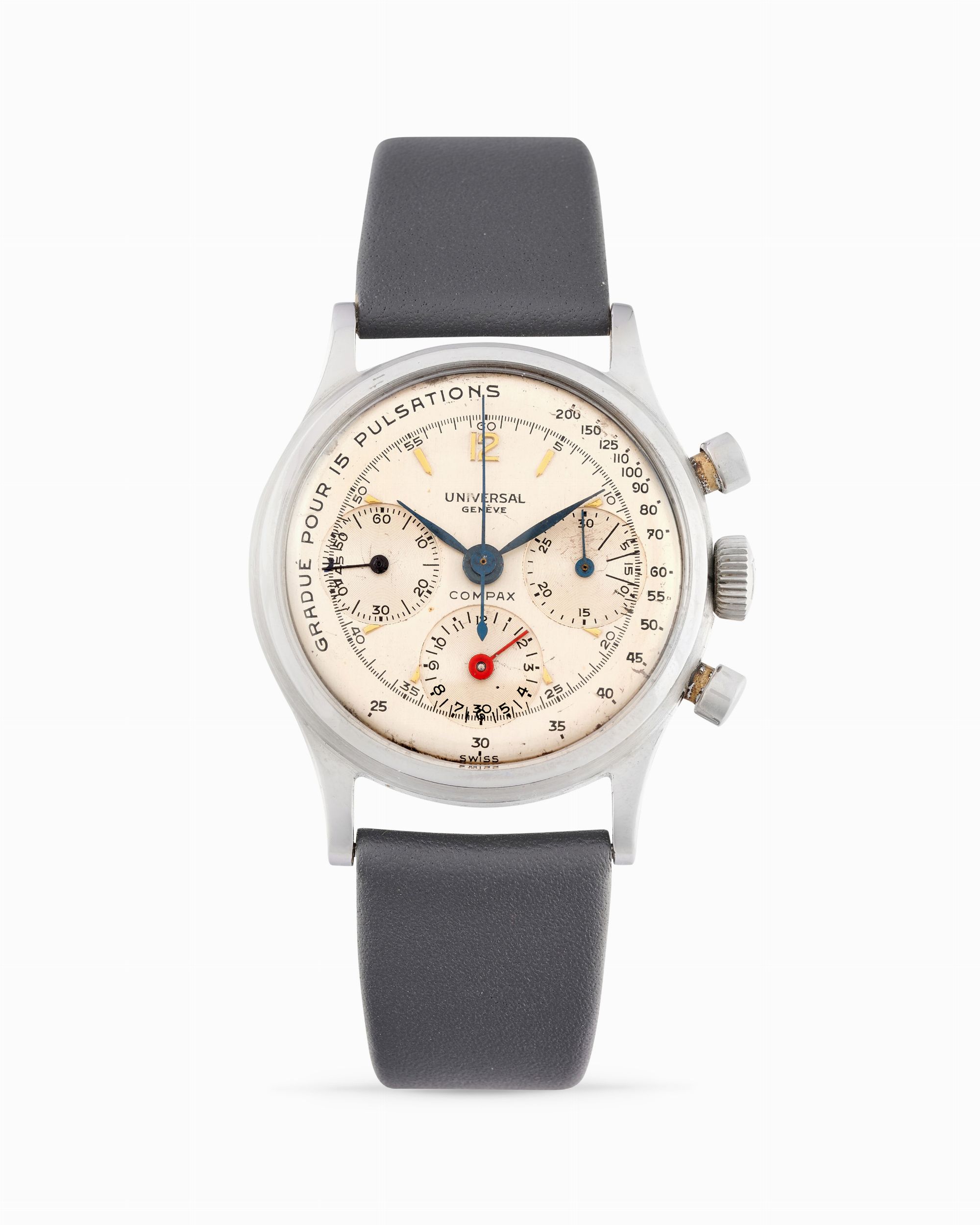 anni 50 Cassa rotonda in acciaio, n.1162422, fondello a vite, pulsanti tondi. Quadrante argenté, scala pulsometrica, indici applicati. Movimento a carica manuale, cal.281. Cinturino in pelle. Dimensioni: 34 mm.