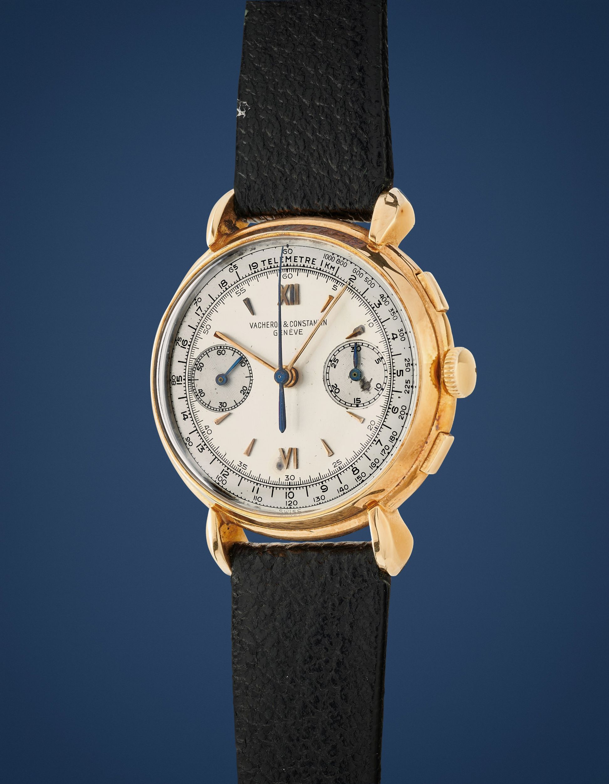 anni 40 Cassa rotonda in oro 18k, n.288903, pulsanti rettangolari, anse a goccia. Quadrante argenté a due toni, indici e numeri romani applicati. Movimento a carica manuale, cal.434, n.446193. Cinturino in pelle. Dimensioni: 36 mm. Accompagnato da estratto d'archivio Vacheron Constantin.