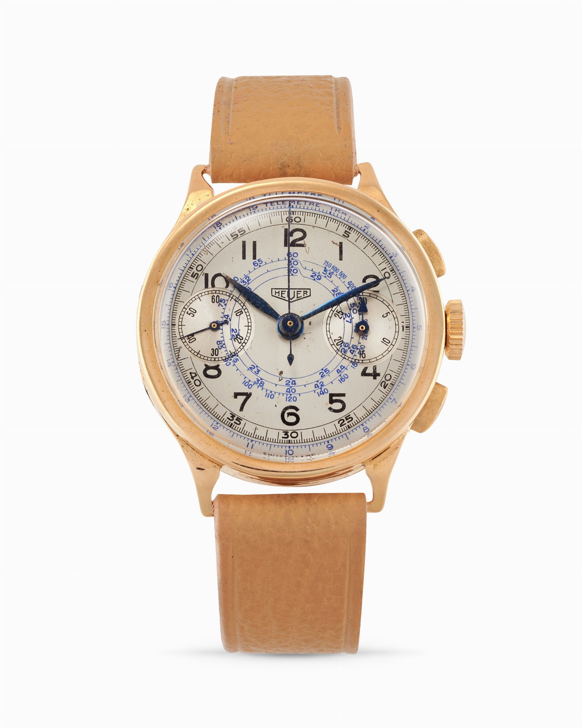 anni 40 Cassa rotonda in oro 18k, n.5916, fondello a cerniera, pulsanti a oliva. Quadrante argenté a due toni, multiscala, numeri arabi dipinti. Movimento a carica manuale. Cinturino in pelle. Dimensioni: 33 mm.