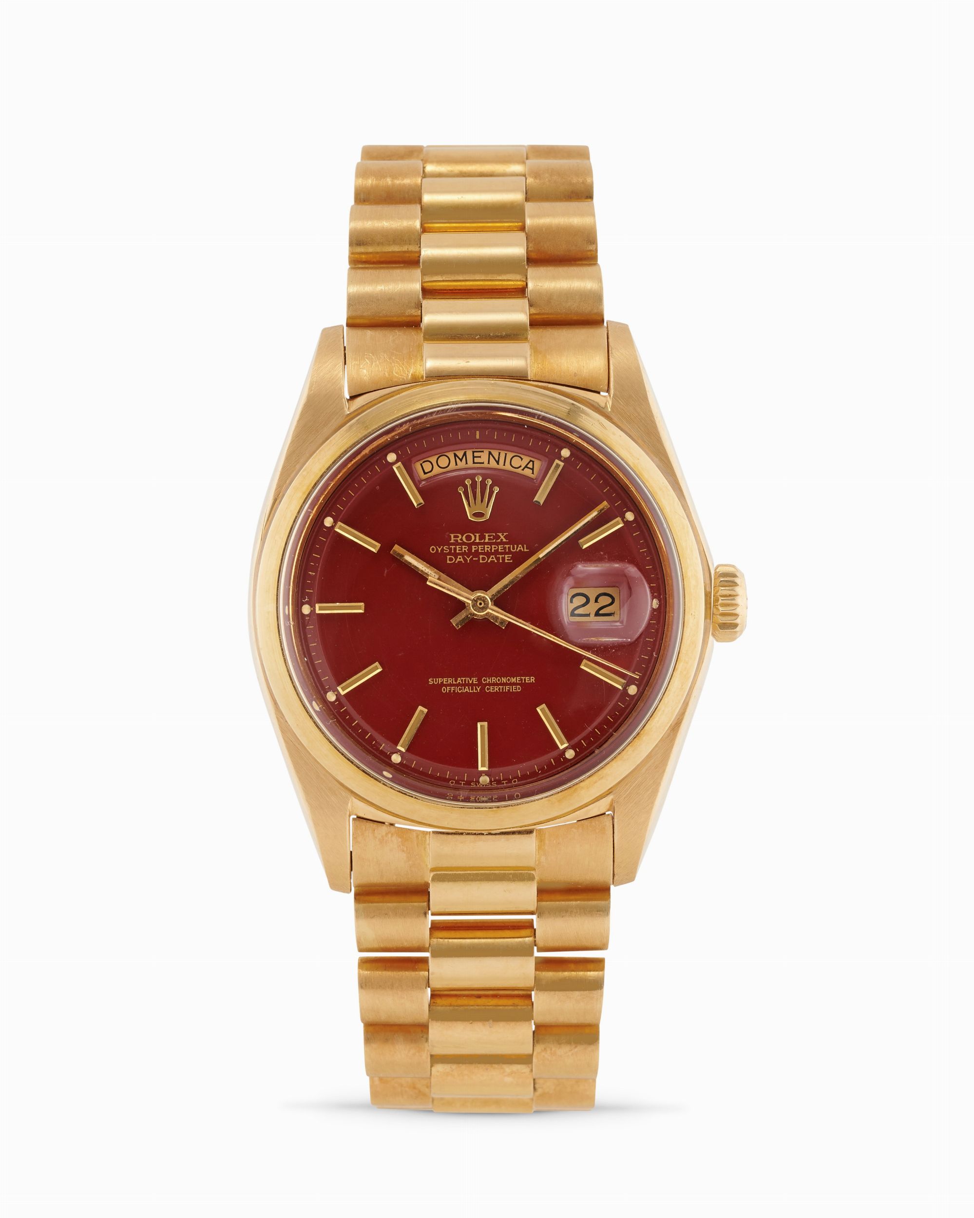 anni 70 Cassa rotonda in oro 18k, n.3781663, lunetta liscia in oro 18k. Quadrante 'Stella' bordeaux, indici applicati. Movimento a carica automatica, cal.1556. Bracciale President in oro 18k. Dimensioni: 36 mm.