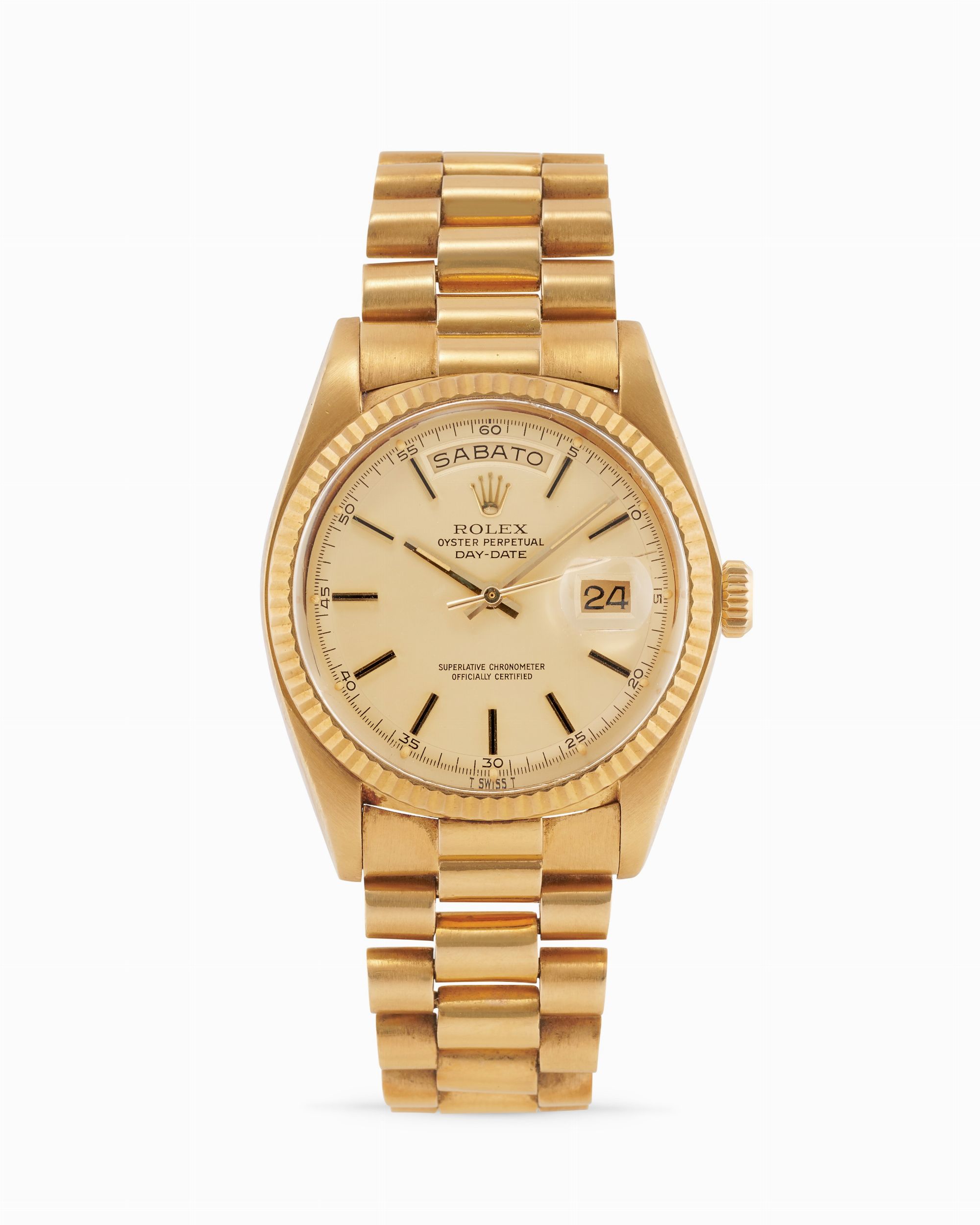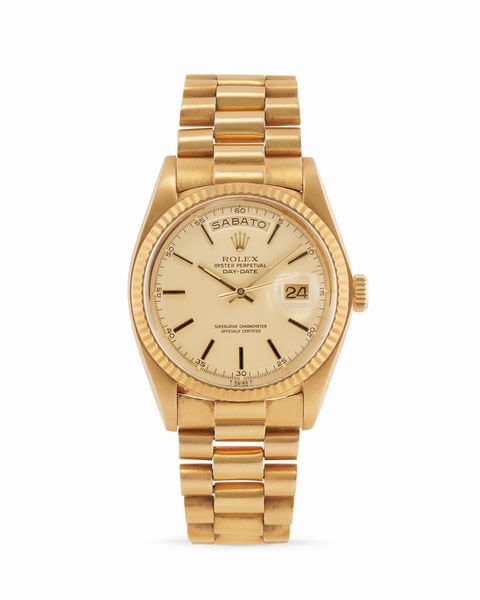 anni 70 Cassa rotonda in oro 18k, n.3652198, lunetta zigrinata in oro 18k. Quadrante champagne con finitura grené, indici applicati smaltati. Movimento a carica automatica, cal.1556. Bracciale President in oro 18k. Dimensioni: 36 mm.