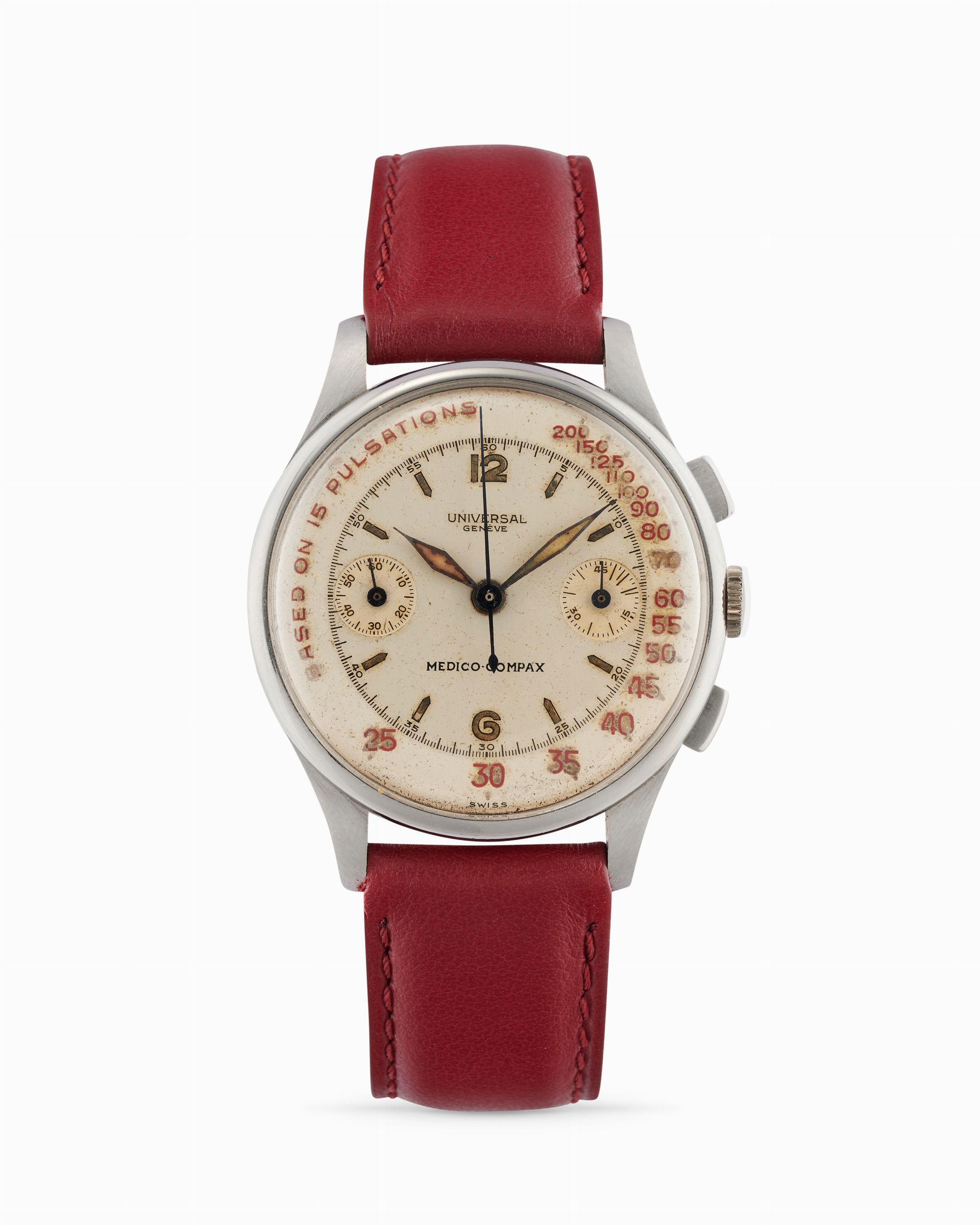 anni 40 Cassa rotonda in acciaio, n.1172603, pulsanti rettangolari. Quadrante color crema, scala pulsometrica, indici e numeri arabi luminescenti. Movimento a carica manuale, cal.285. Cinturino in pelle. Dimensioni: 35 mm.